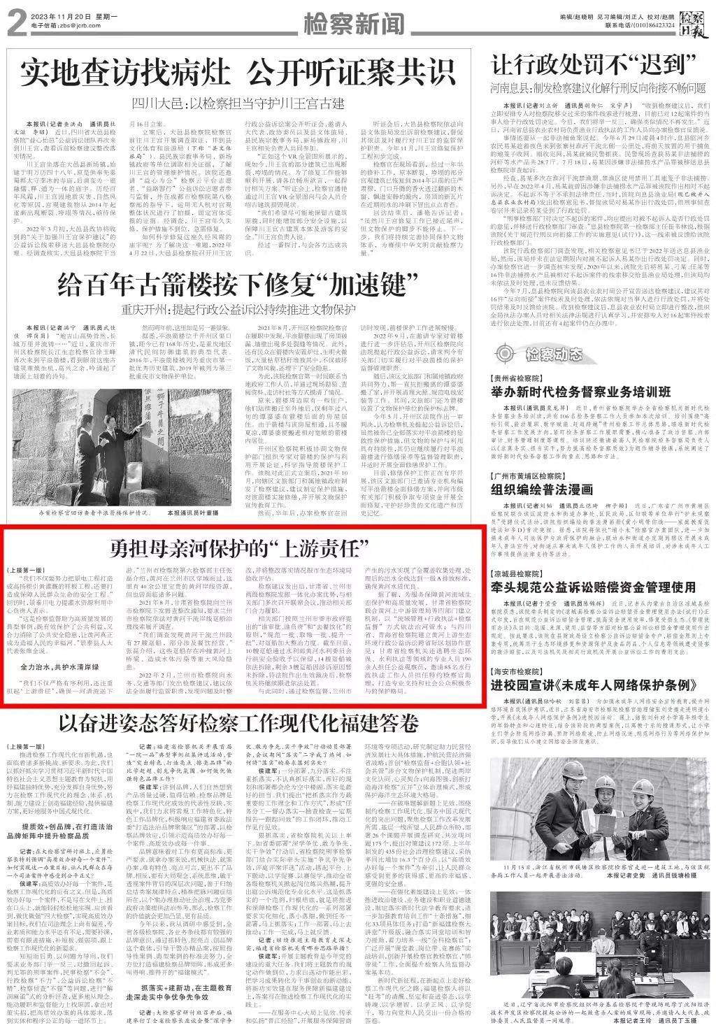 2023年11月20日,检察日报头版头条刊发《勇担母亲河保护的“上游责任”——甘肃:以高质效履职办案保障黄河长治久安》。