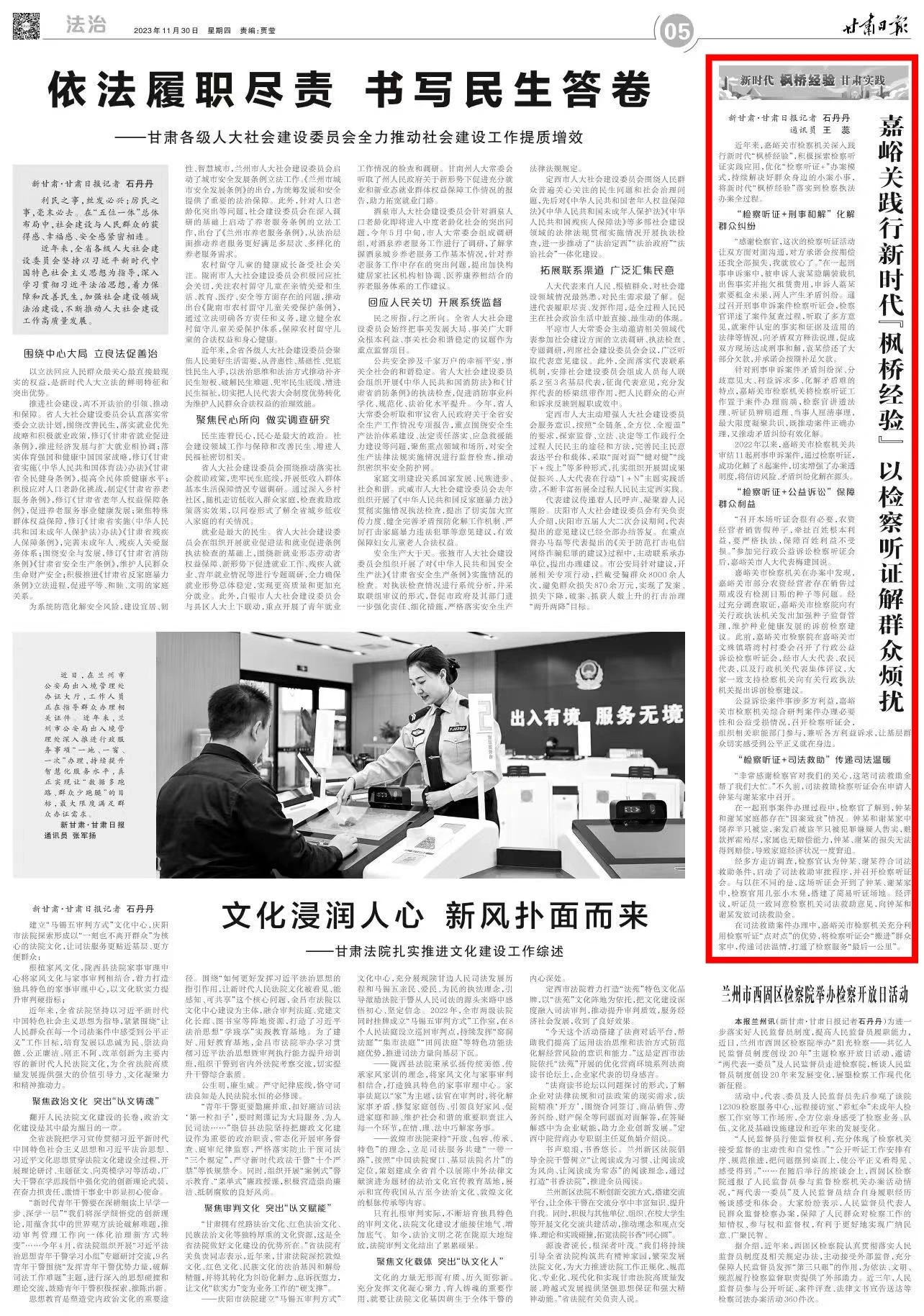 2023年11月30日,甘肃日报刊发《嘉峪关践行新时代“枫桥经验” 以检察听证解群众烦扰》。