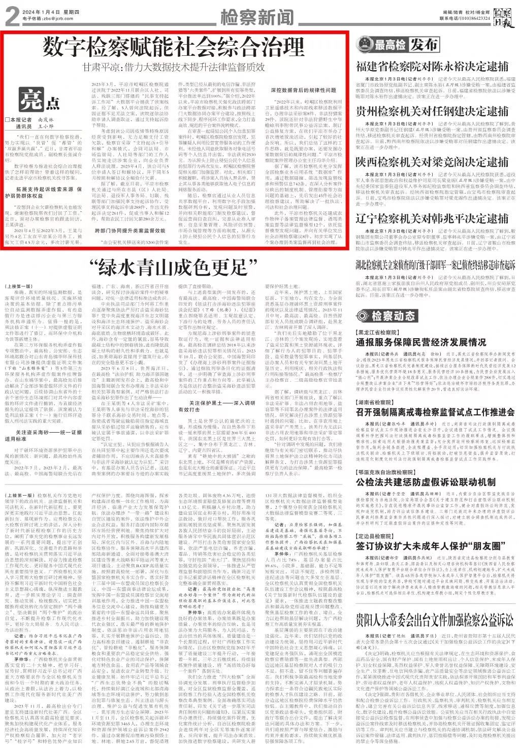 2024年1月4日,检察日报二版头条刊发《数字检察赋能社会综合治理——甘肃平凉:借力大数据技术提升法律监督质效》。