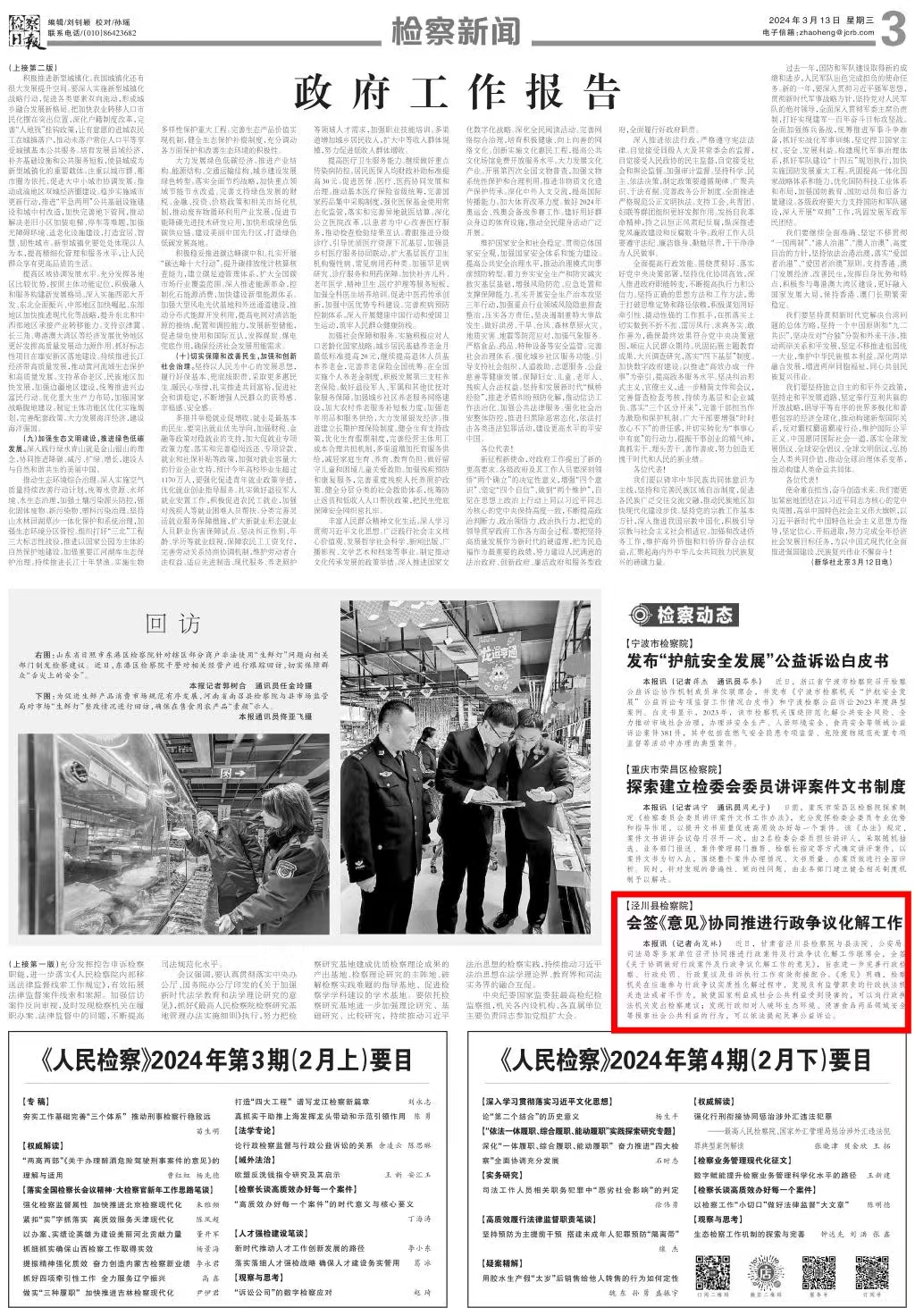 2024年3月13日,检察日报刊发《泾川县检察院:会签〈意见〉协同推进行政争议化解工作》。