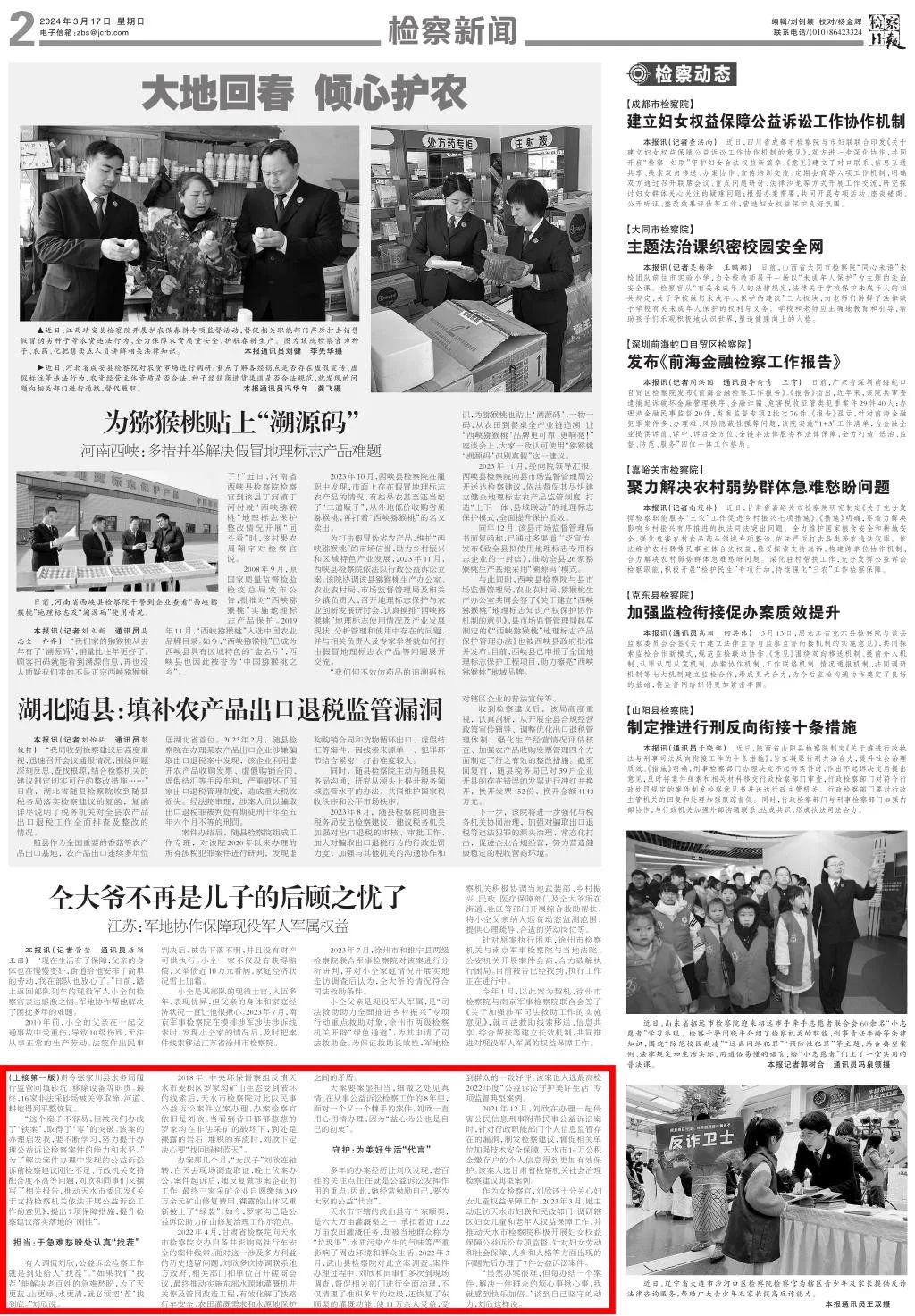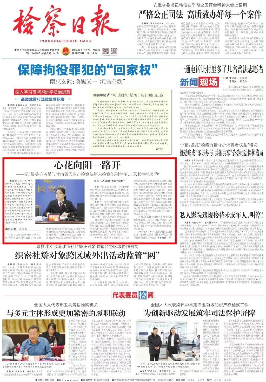 2024年3月17日,检察日报头版刊发《心花向阳一路开——记“最美公务员”,甘肃省天水市检察院第六检察部副主任、二级检察官刘欣》。