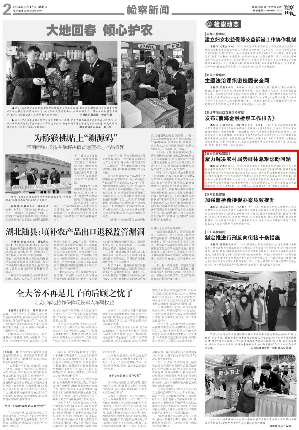 2024年3月17日,检察日报刊发《嘉峪关市检察院:聚力解决农村弱势群体急难愁盼问题》。