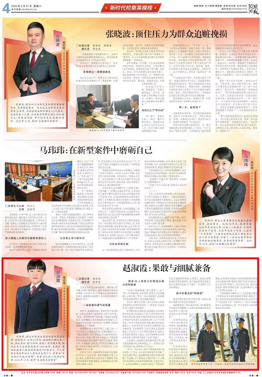 2024年3月27日,检察日报新时代检察英模榜刊发《赵淑霞:果敢与细腻兼备》。