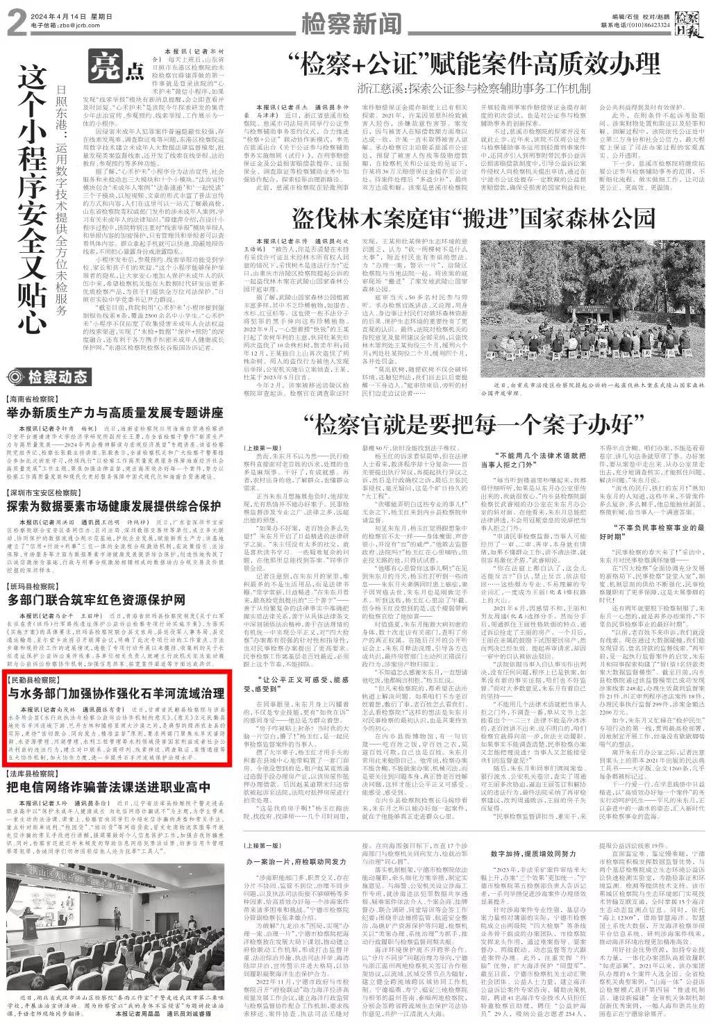 2024年4月14日,检察日报刊发《民勤县检察院:与水务部门加强协作强化石羊河流域治理》。