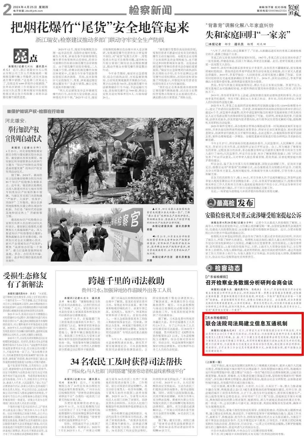 2024年4月25日,检察日报刊发《天水市检察院:联合法院司法局建立信息互通机制》。