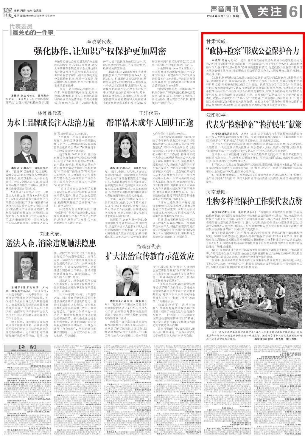 2024年5月13日,检察日报声音周刊刊发《甘肃武威:“政协+检察”形成公益保护合力》。