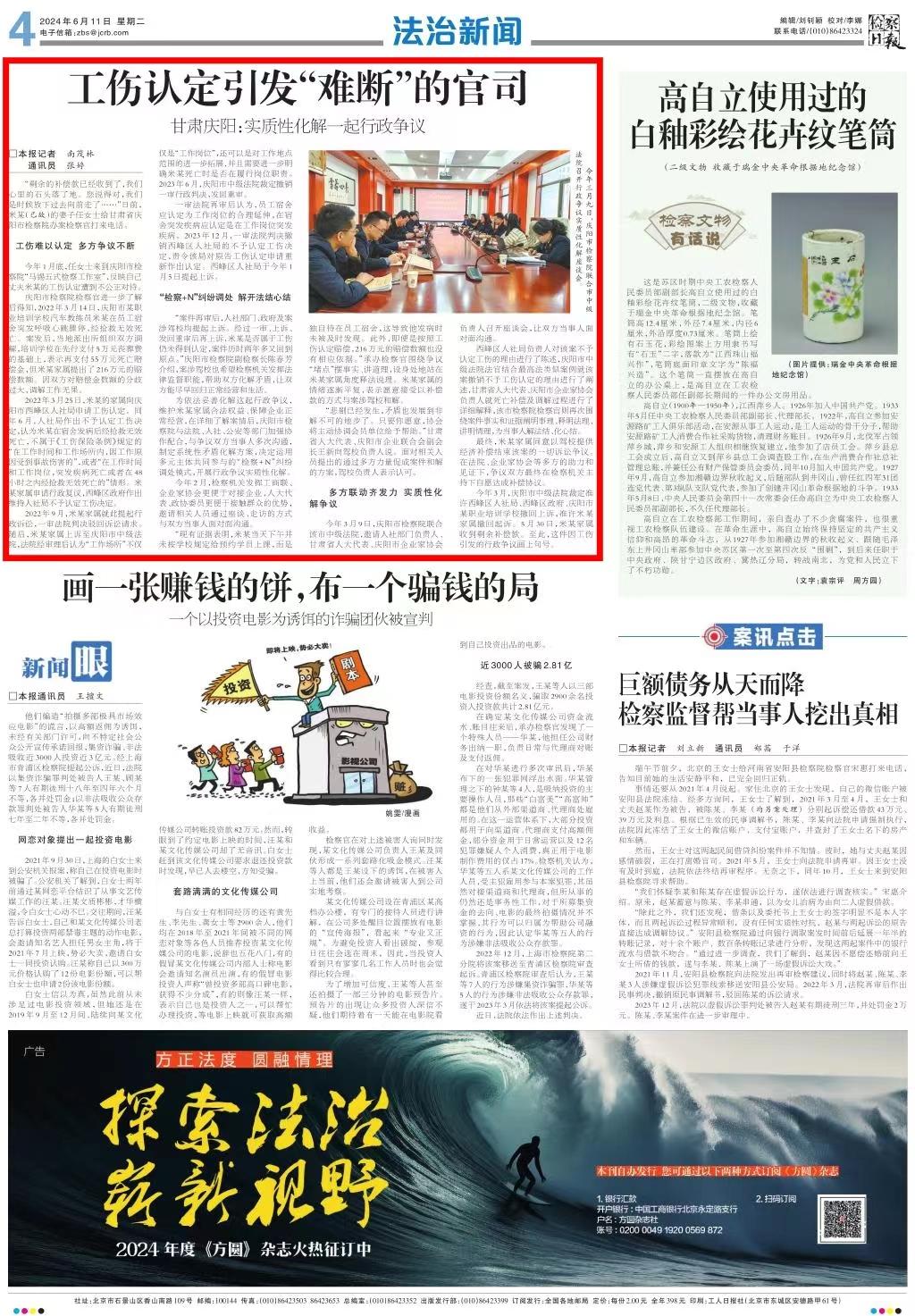 2024年6月11日,检察日报法治新闻刊发《工伤认定引发“难断”的官司——甘肃庆阳:实质性化解一起行政争议》。