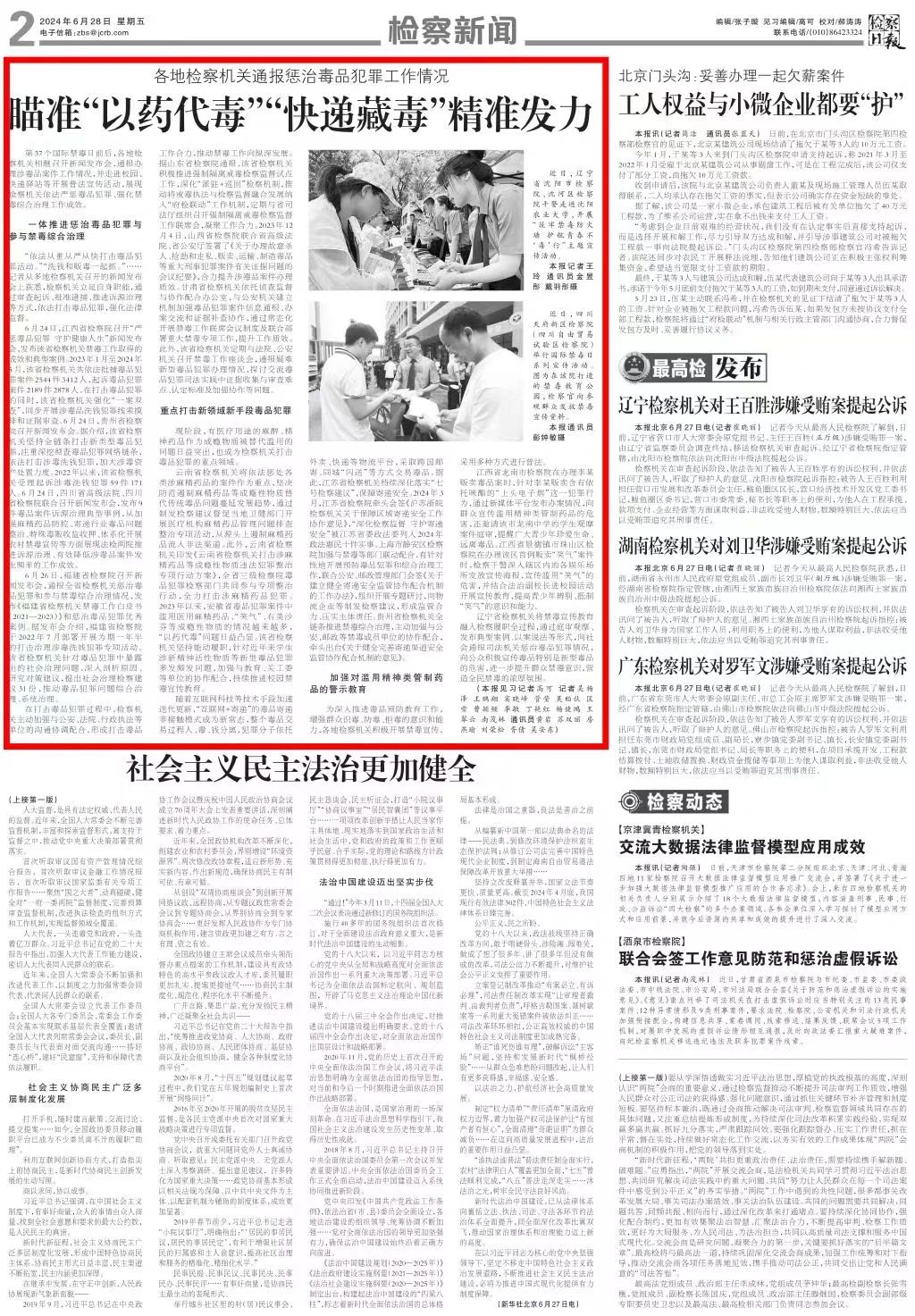 2024年6月28日,检察日报刊发《各地检察机关通报惩治毒品犯罪工作情况——瞄准“以药代毒”“快递藏毒”精准发力》。