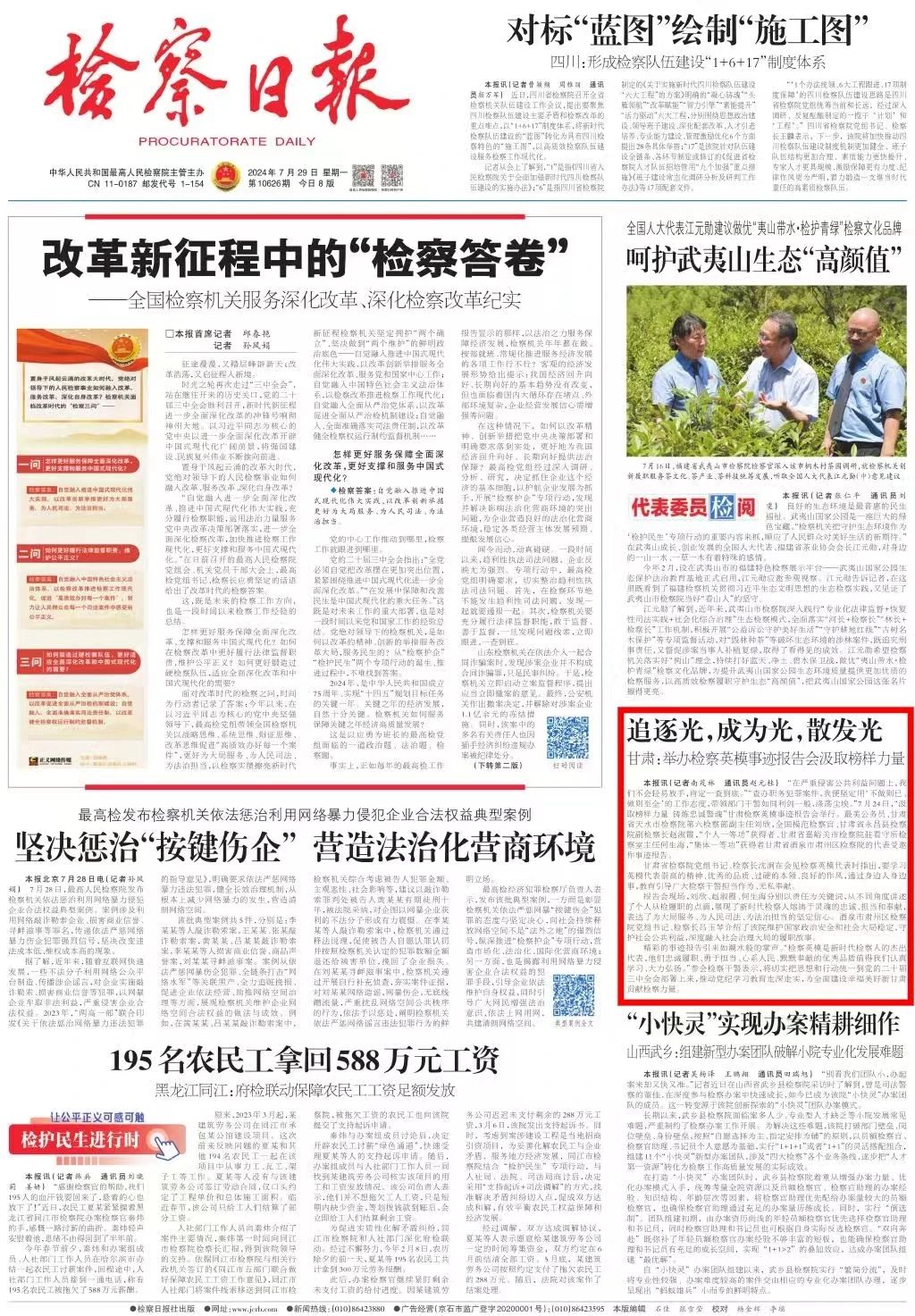 2024年7月29日,检察日报头版刊发《追逐光,成为光,散发光——甘肃:举办检察英模事迹报告会汲取榜样力量》。