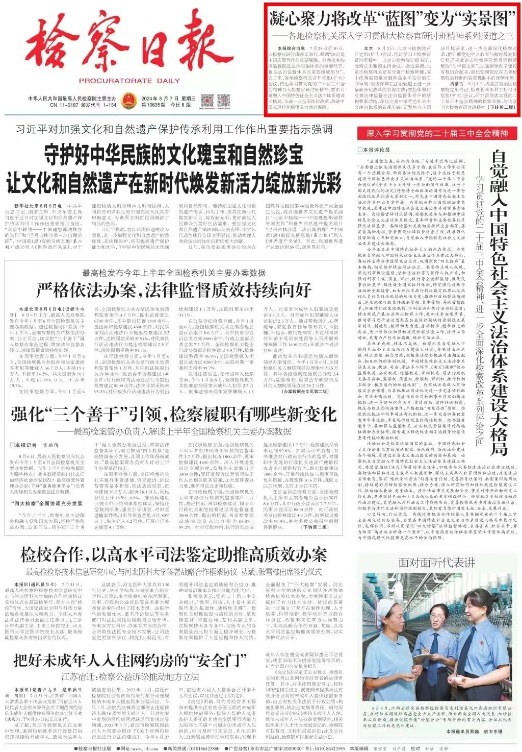 2024年8月7日,检察日报头版刊发《凝心聚力将改革“蓝图”变为“实景图”——各地检察机关深入学习贯彻大检察官研讨班精神系列报道之三》。