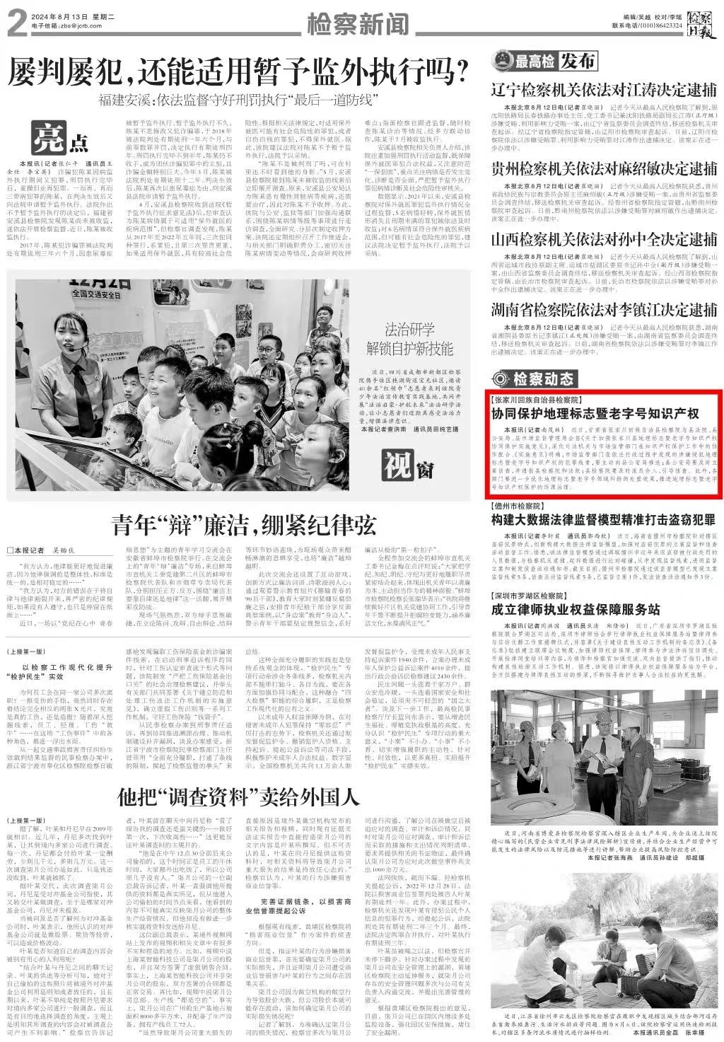 2024年8月13日,检察日报刊发《张家川回族自治县检察院:协同保护地理标志暨老字号知识产权》。