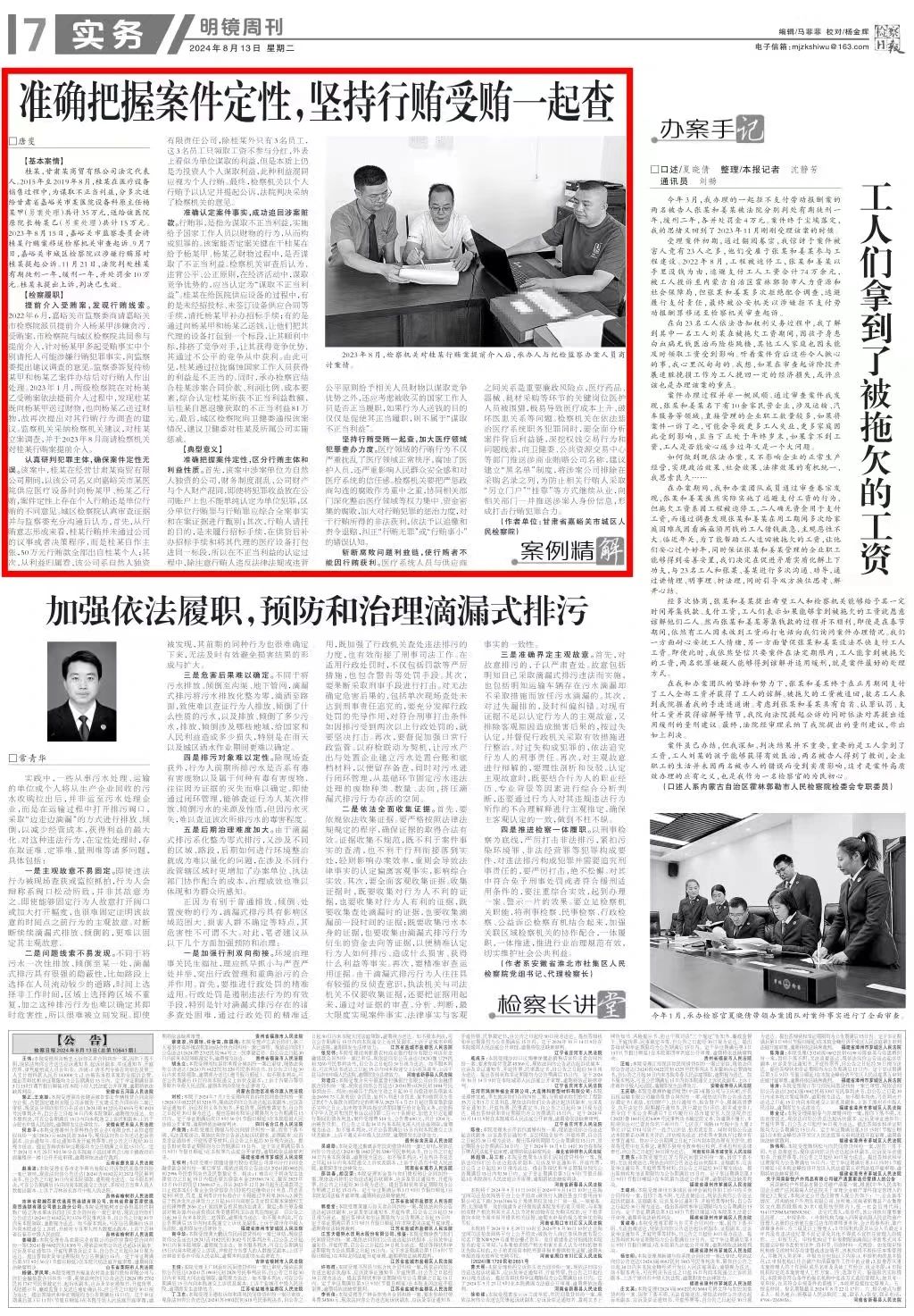 2024年8月13日,检察日报明镜周刊刊发《准确把握案件定性,坚持行贿受贿一起查》。