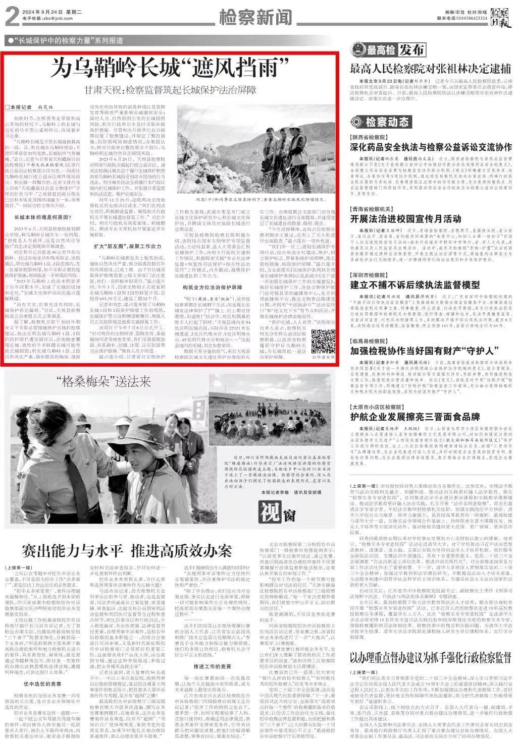 2024年9月24日,检察日报二版头条刊发《为乌鞘岭长城“遮风挡雨”——甘肃天祝:检察监督筑起长城保护法治屏障》。