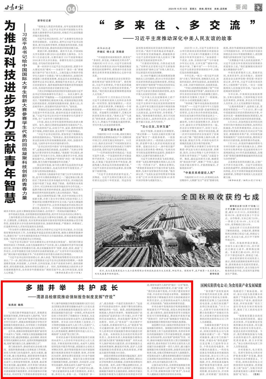2024年10月18日,甘肃日报刊发《多措并举 共护成长——渭源县检察院推动强制报告制度发挥“疗效”》。