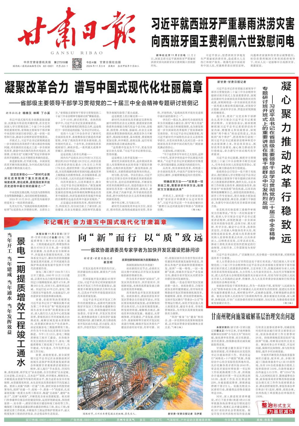 2024年11月3日,甘肃日报头版刊发《凝心聚力推动改革行稳致远——习近平总书记在省部级主要领导干部学习贯彻党的二十届三中全会精神专题研讨班开班式上的重要讲话在我省干部群众中引发热烈反响》。
