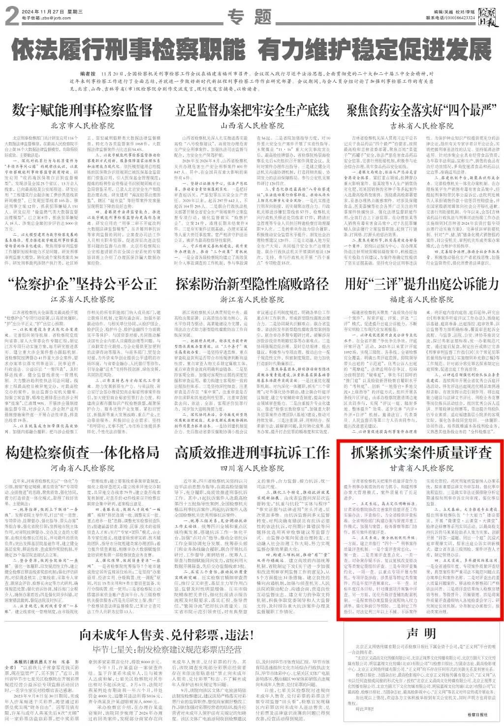2024年11月27日,检察日报刊发《抓紧抓实案件质量评查》。