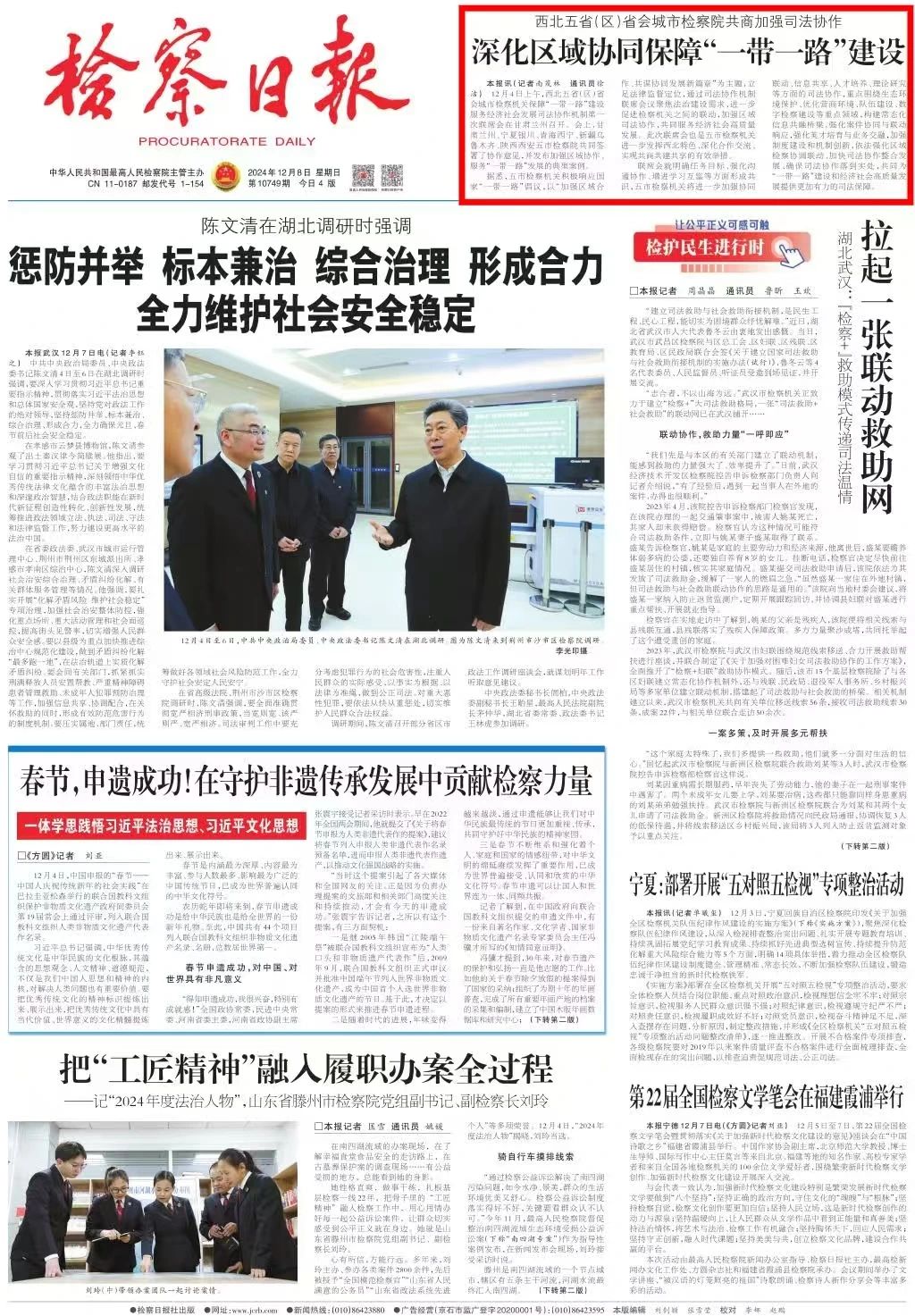 2024年12月8日,检察日报头版刊发《西北五省(区)省会城市检察院共商加强司法协作 深化区域协同保障“一带一路”建设》。