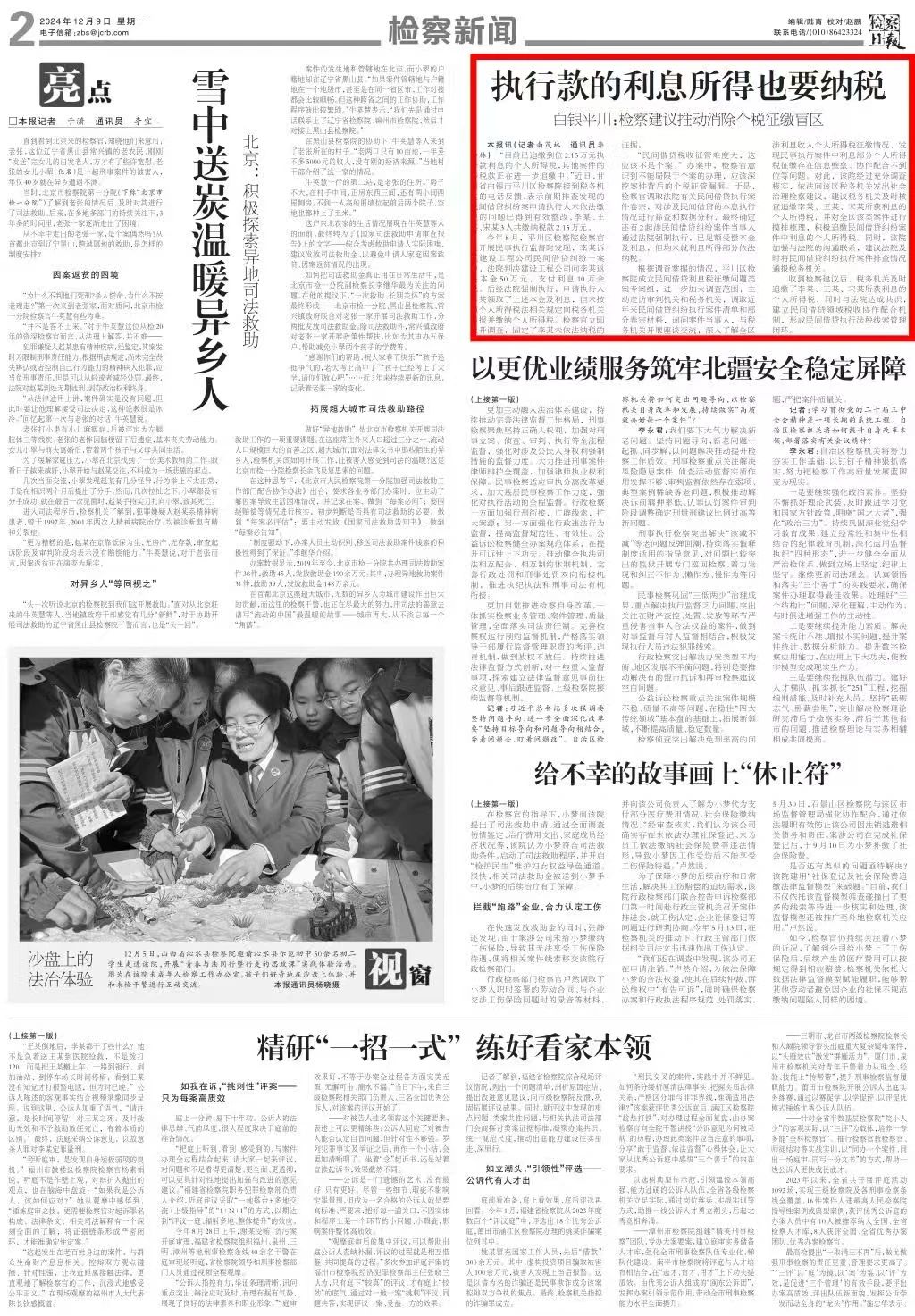 2024年12月9日,检察日报刊发《执行款的利息所得也要纳税——白银平川:检察建议推动消除个税征缴盲区》。