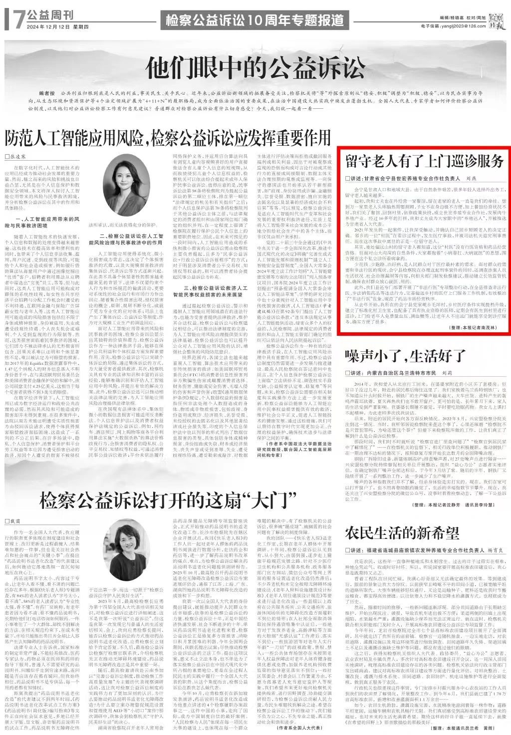 2024年12月12日,检察日报公益周刊刊发《留守老人有了上门巡诊服务》。
