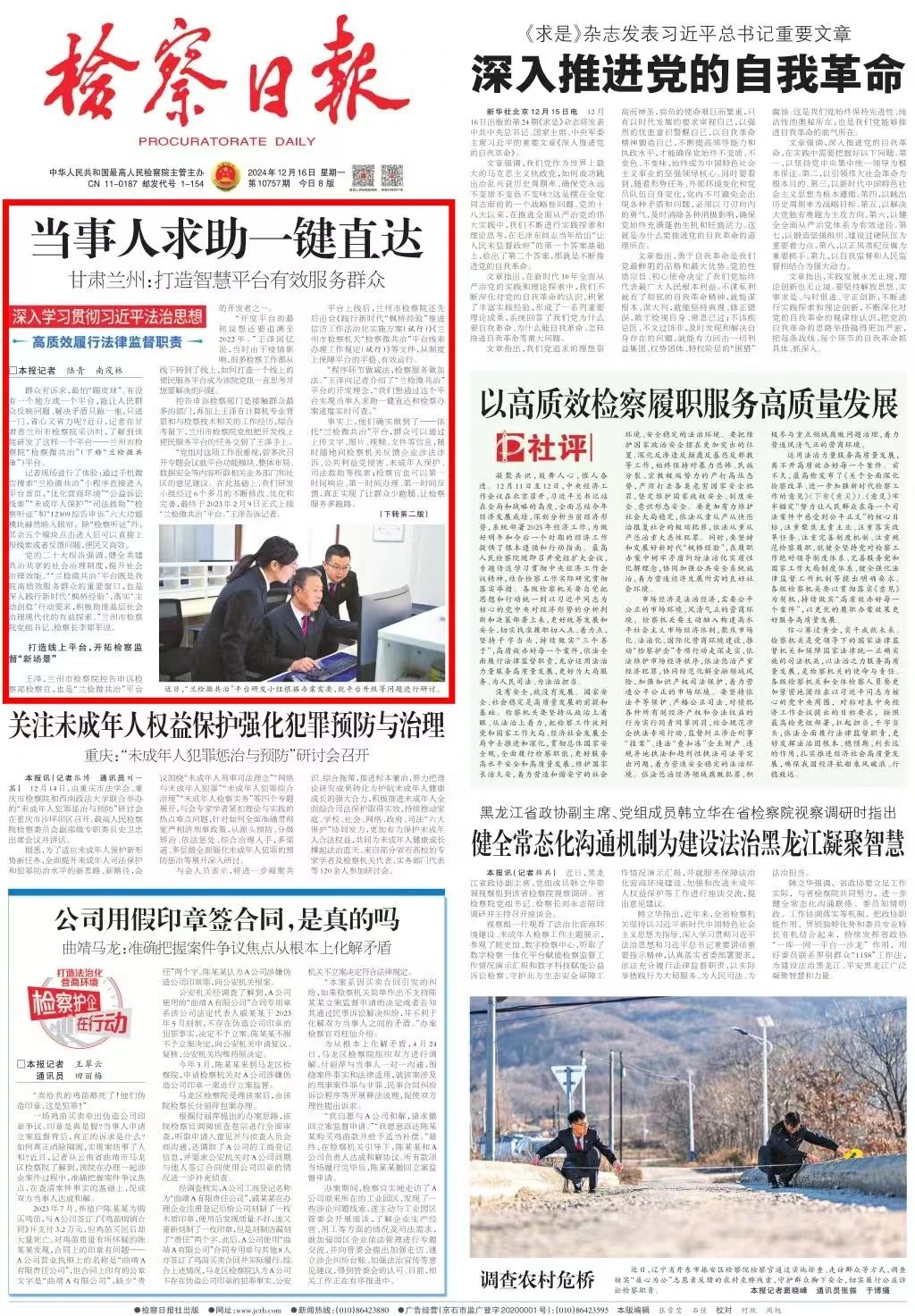 2024年12月16日,检察日报头版头条刊发《当事人求助一键直达——甘肃兰州:打造智慧平台有效服务群众》。