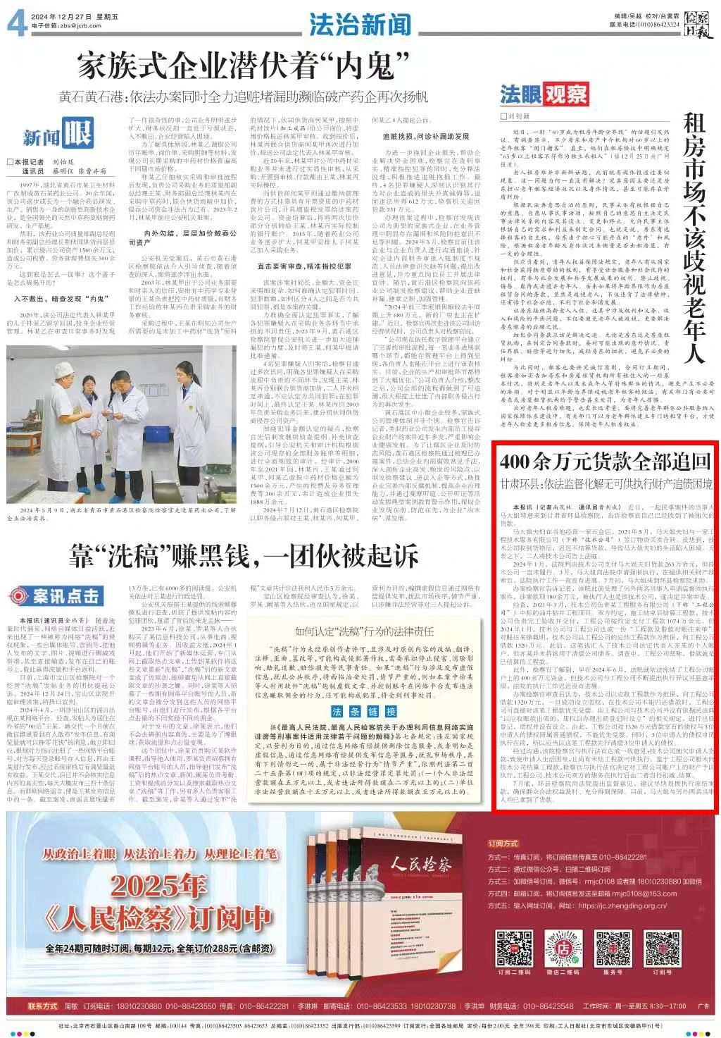 2024年12月27日,检察日报刊发《400余万元货款全部追回——甘肃环县:依法监督化解无可供执行财产追债困境》。