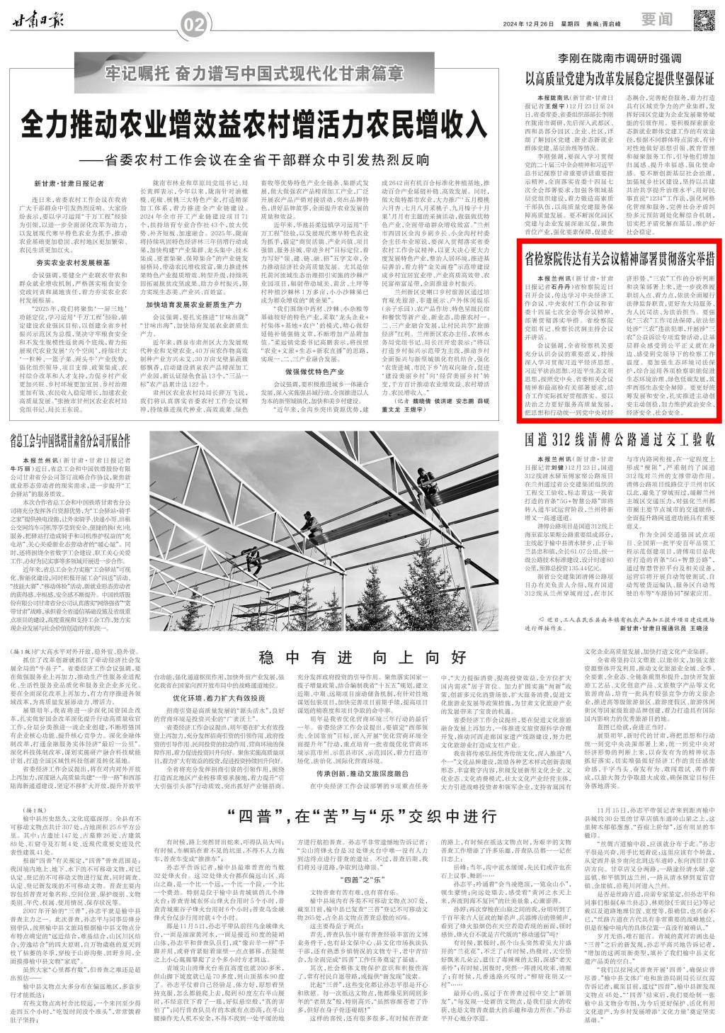 2024年12月26日,甘肃日报刊发《省检察院传达有关会议精神部署贯彻落实举措》。