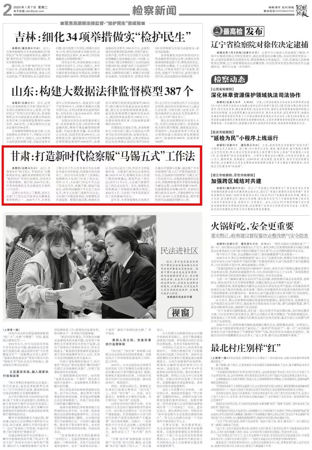 2025年1月7日,检察日报刊发《甘肃:打造新时代检察版“马锡五式”工作法》。