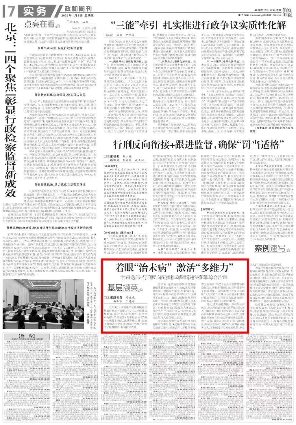 2025年1月8日,检察日报政和周刊刊发《着眼“治未病” 激活“多维力”——甘肃迭部:行刑反向衔接推动赌博违法犯罪综合治理》。