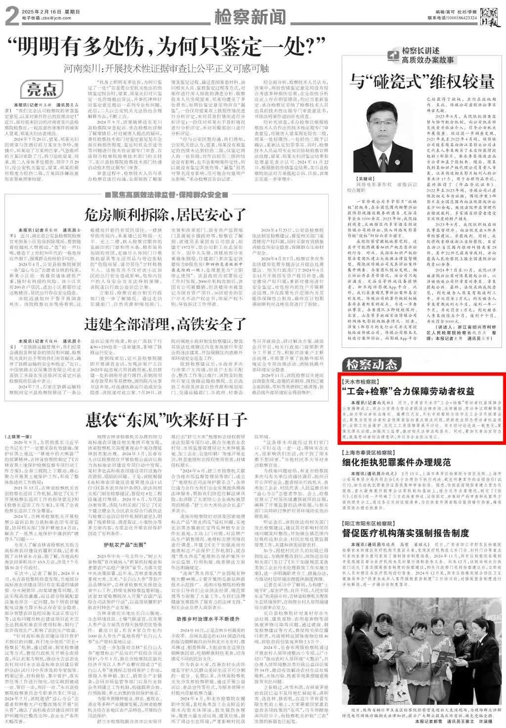 2025年2月16日,检察日报刊发《天水市检察院:“工会+检察”合力保障劳动者权益》。