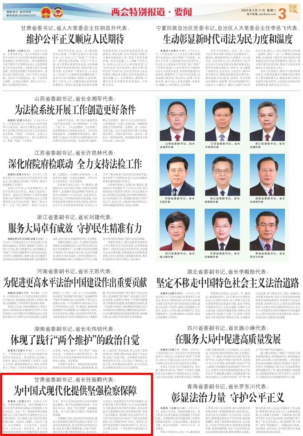 2025年3月11日,检察日报《两会特别报道·要闻》专栏刊发《甘肃省委副书记、省长任振鹤代表:为中国式现代化提供坚强检察保障》。