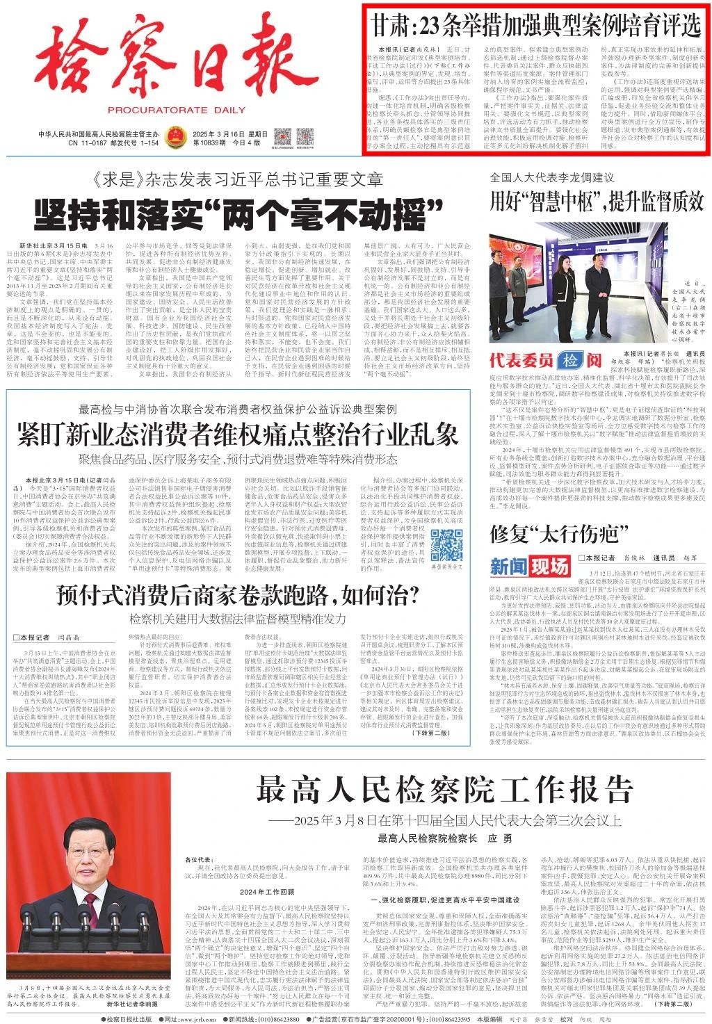 2025年3月16日,检察日报头版刊发《甘肃:23条举措加强典型案例培育评选》。