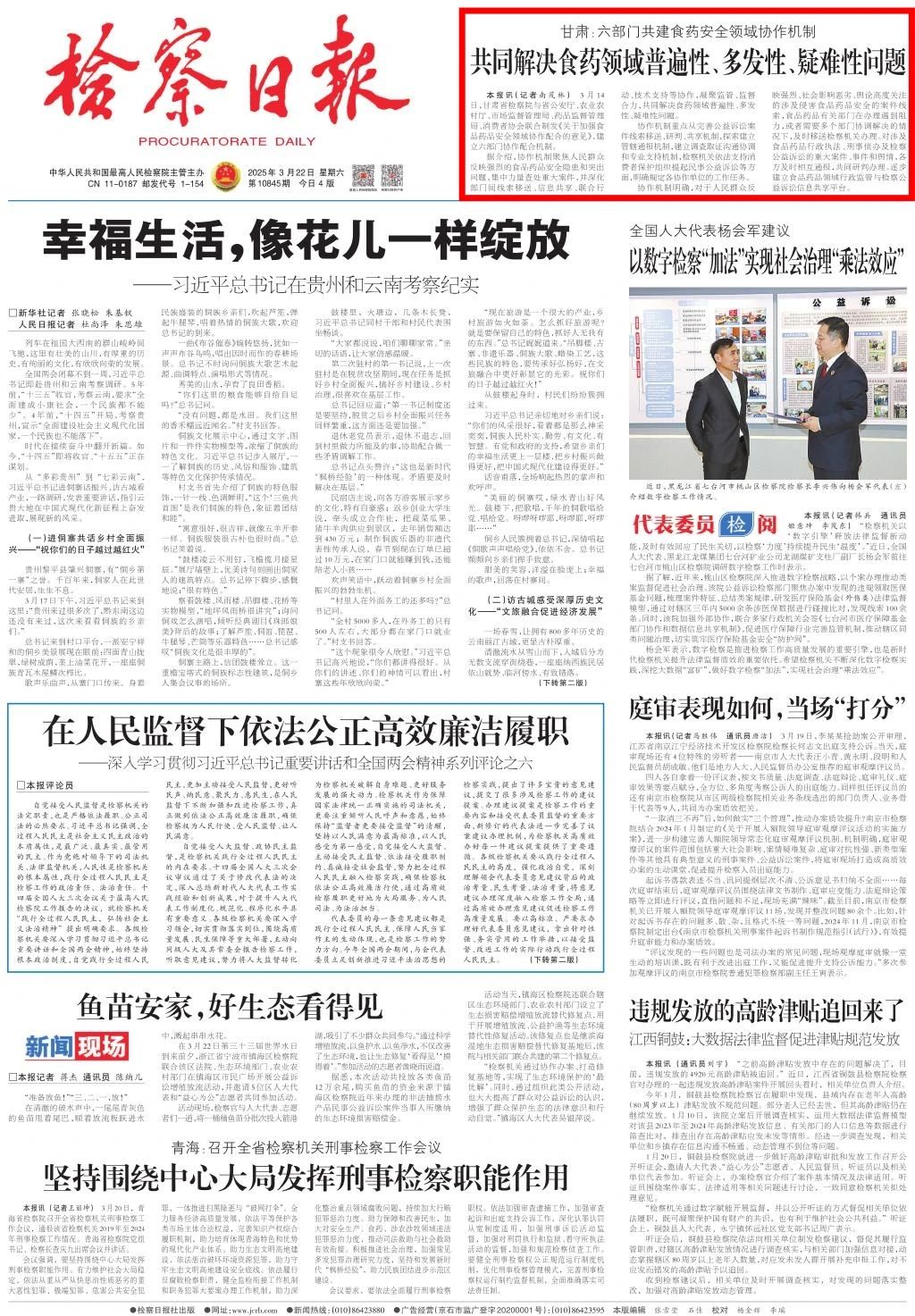 2025年3月22日,检察日报头版刊发《甘肃:六部门共建食药安全领域协作机制——共同解决食药领域普遍性、多发性、疑难性问题》。