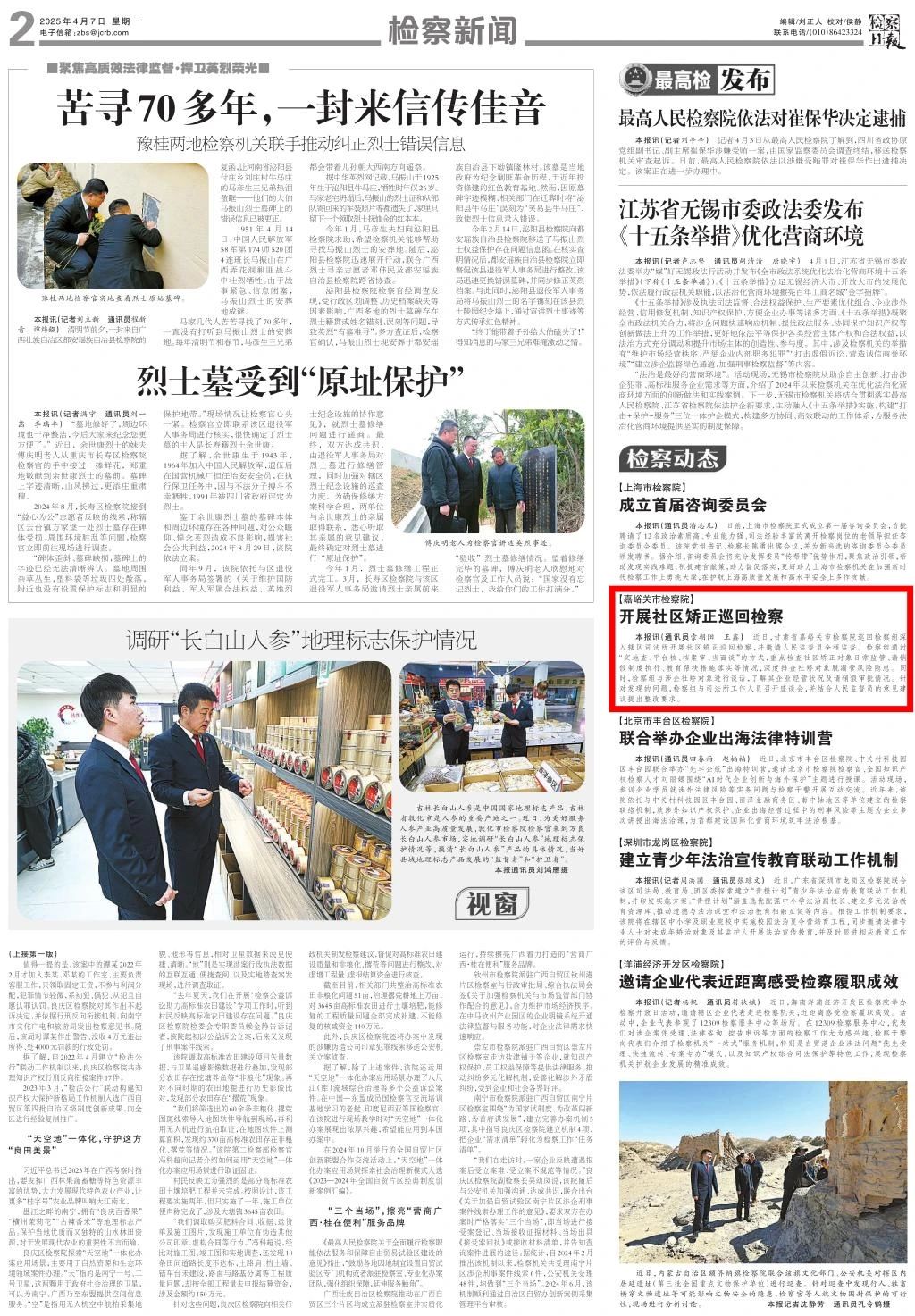 2025年4月7日,检察日报刊发《嘉峪关市检察院:开展社区矫正巡回检察》。