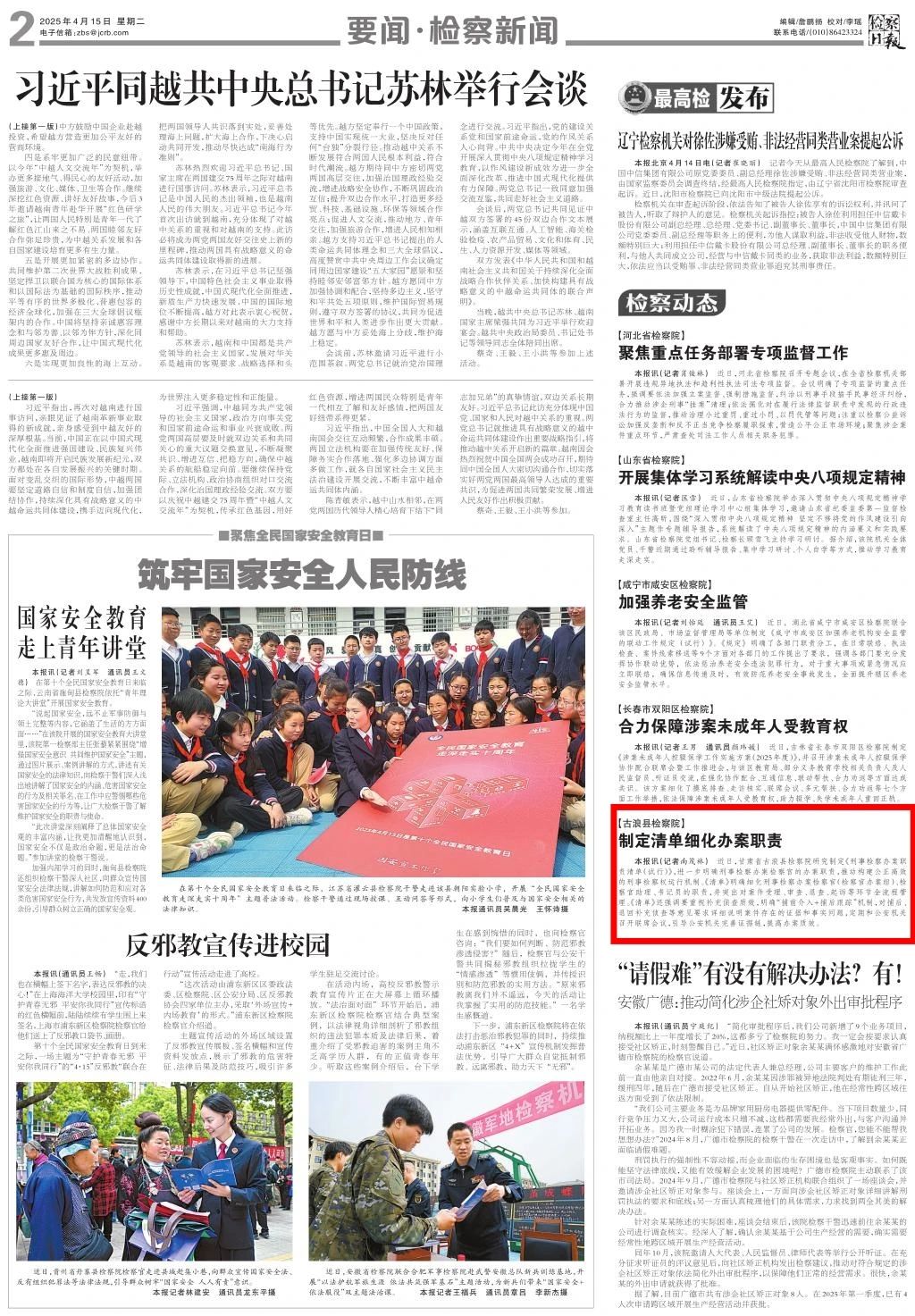 2025年4月15日,检察日报刊发《古浪县检察院:制定清单细化办案职责》。