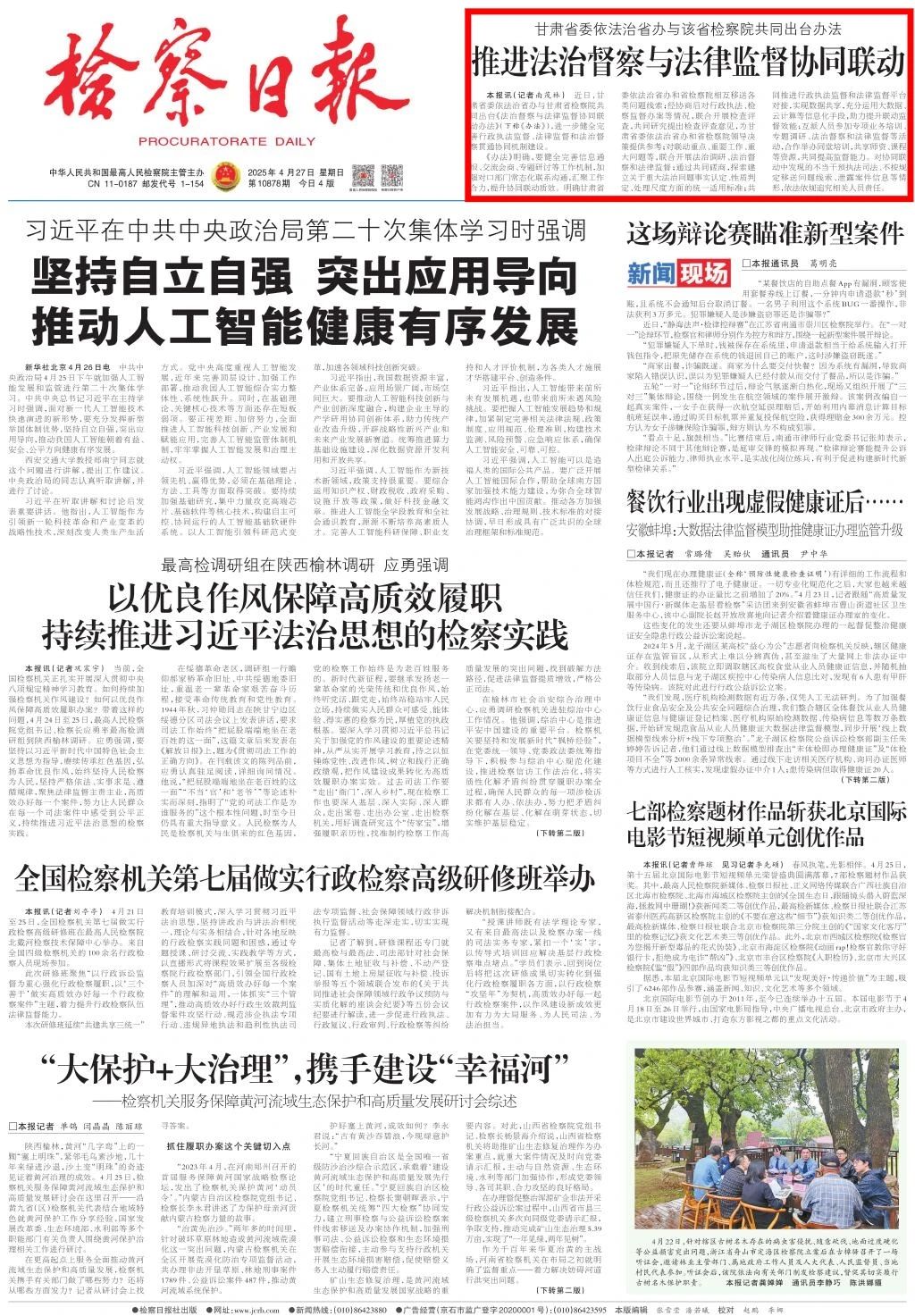 2025年4月27日,检察日报头版刊发《甘肃省委依法治省办与该省检察院共同出台办法 推进法治督察与法律监督协同联动》。