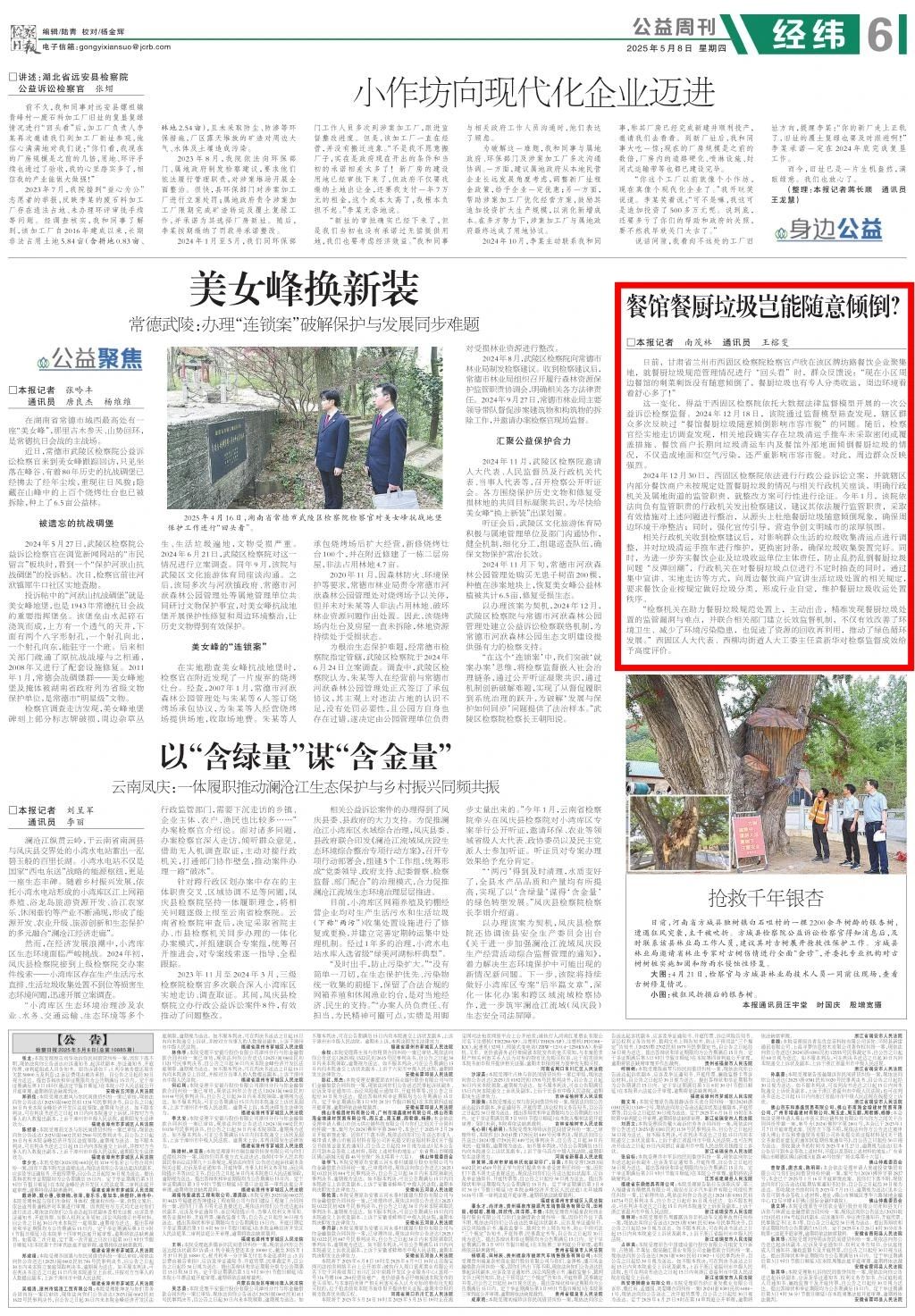 2025年5月8日,检察日报公益周刊刊发《餐馆餐厨垃圾岂能随意倾倒?》。