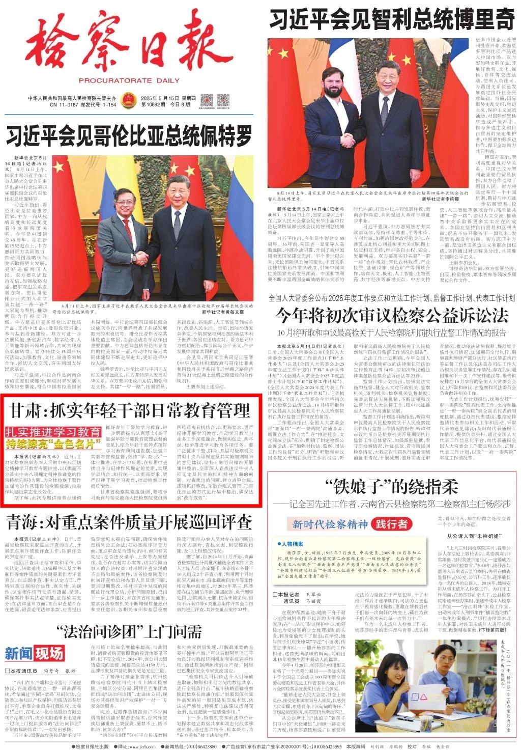 2025年5月15日,检察日报头版刊发《甘肃:抓实年轻干部日常教育管理》。