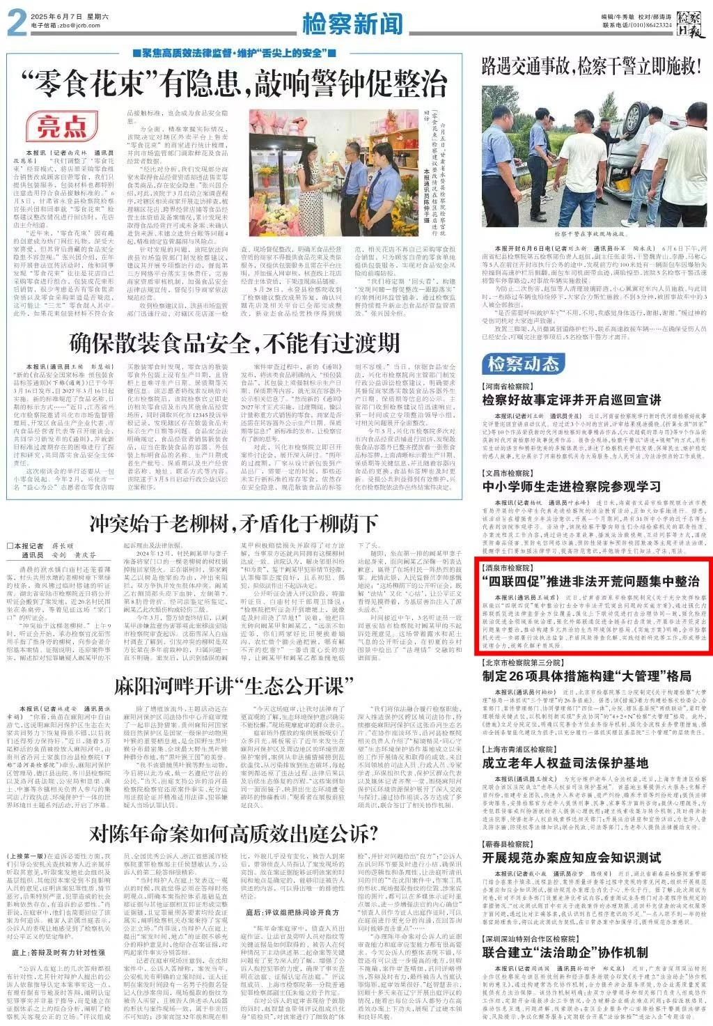 2025年6月7日,检察日报刊发《酒泉市检察院:“四联四促”推进非法开荒问题集中整治》。