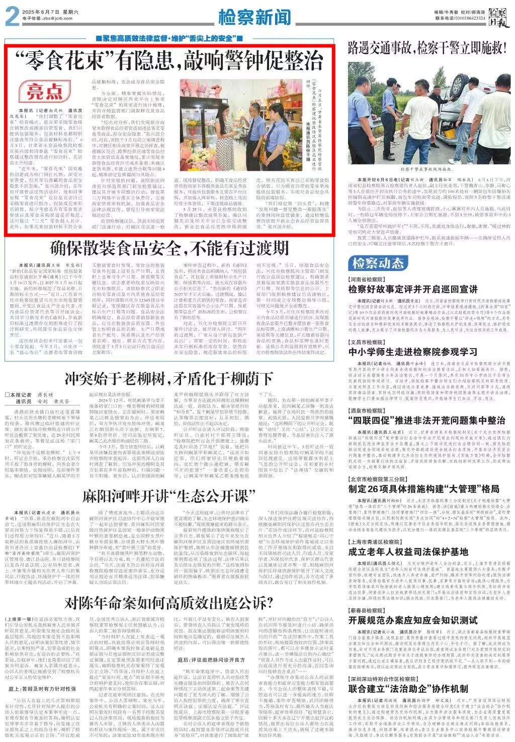 2025年6月7日,检察日报刊发《“零食花束”有隐患,敲响警钟促整治》。