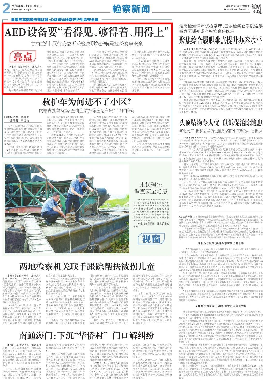 2025年6月21日,检察日报刊发《AED设备要“看得见、够得着、用得上” 甘肃兰州:履行公益诉讼检察职能护航马拉松赛事安全》。