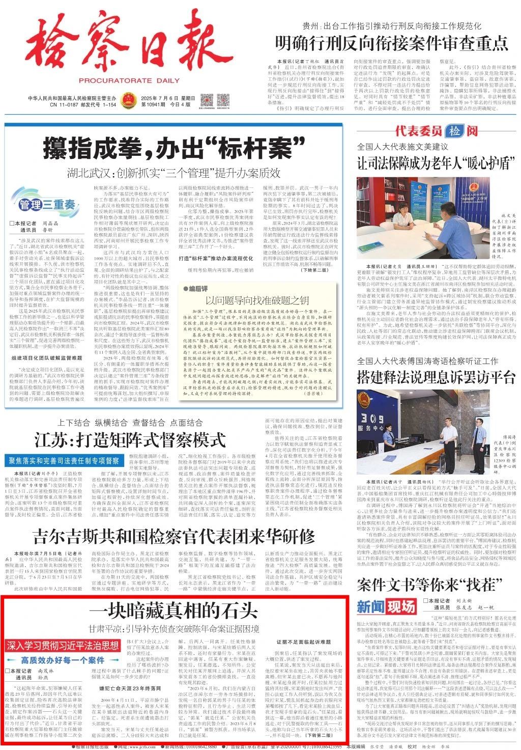 2025年7月6日,检察日报头版刊发《一块暗藏真相的石头——甘肃平凉:引导补充侦查突破陈年命案证据困境》。