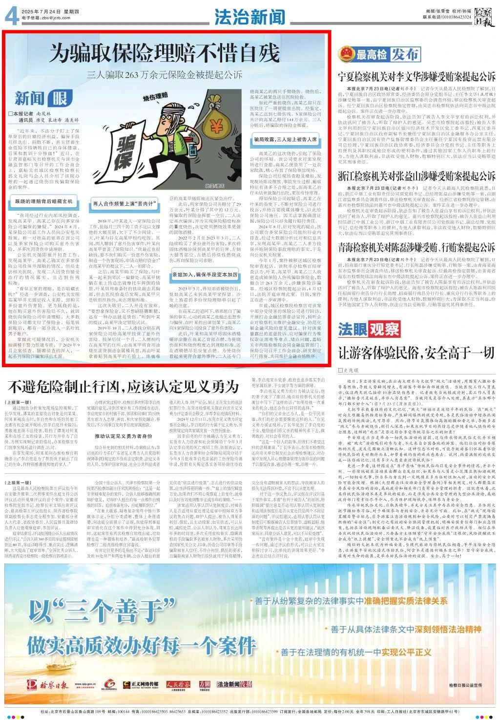 2025年7月24日,检察日报刊发《为骗取保险理赔不惜自残 三人骗取263万余元保险金被提起公诉》。