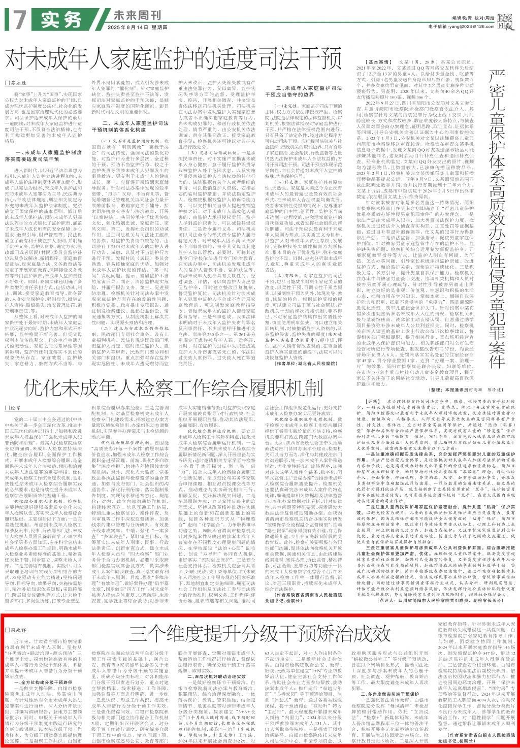 2025年8月14日,检察日报未来周刊刊发《三个维度提升分级干预矫治成效》。