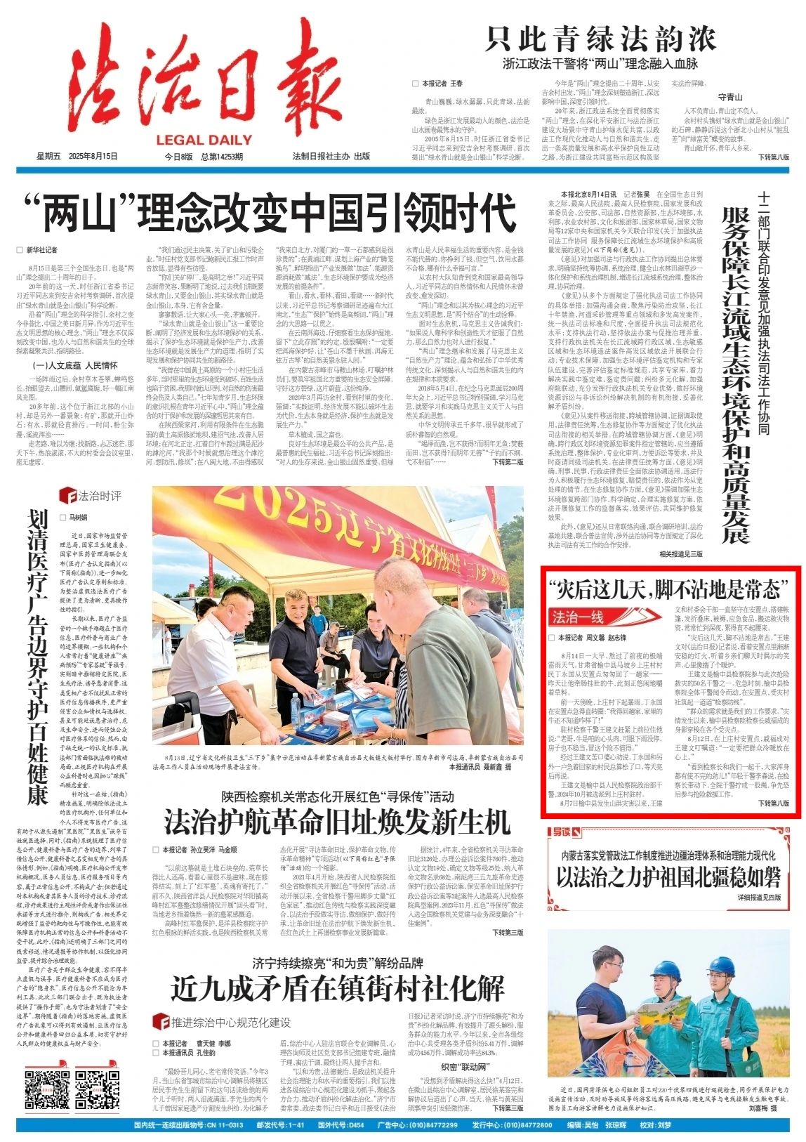 2025年8月15日,法治日报头版刊发《 “灾后这几天,脚不沾地是常态”》。