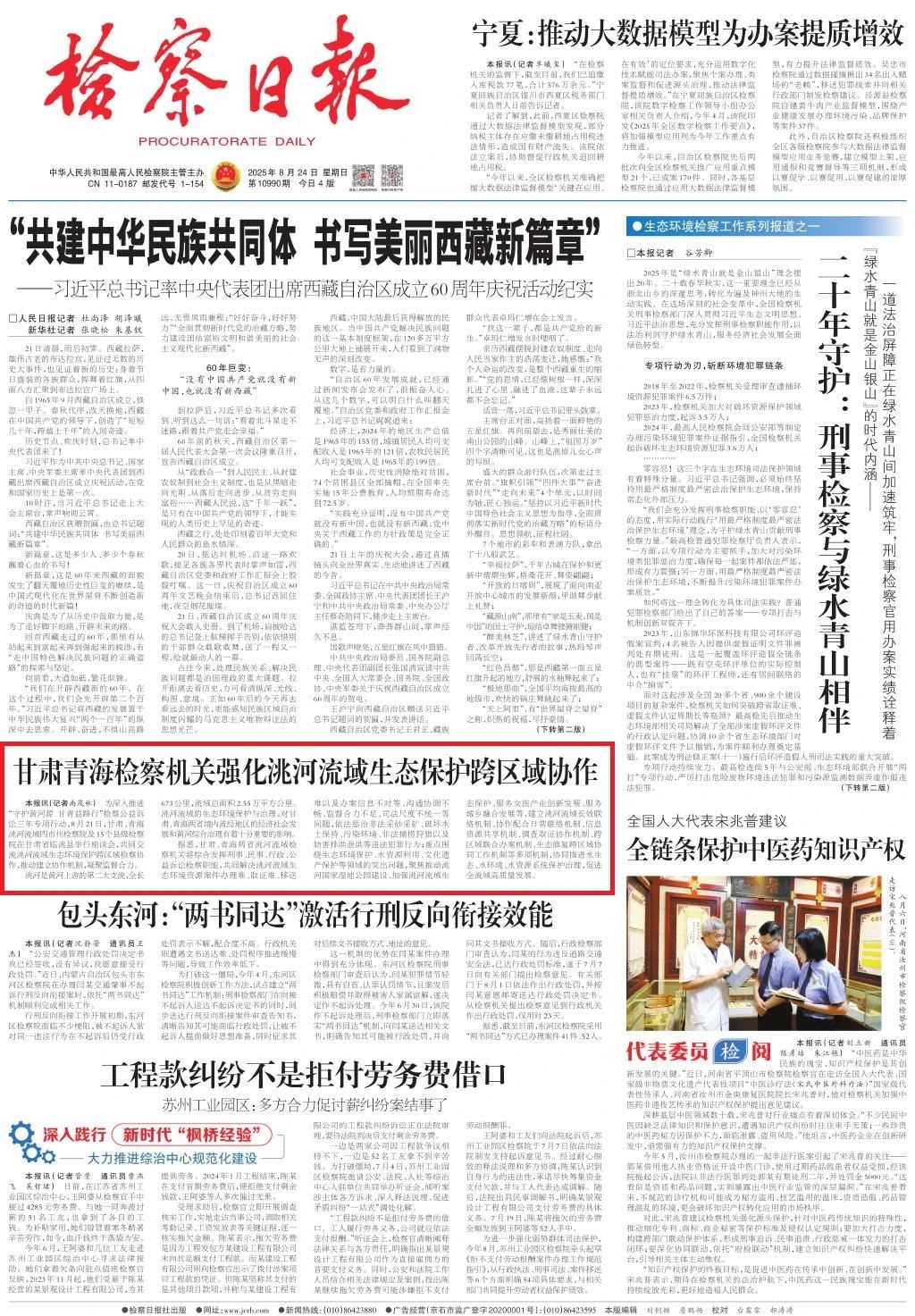 2025年8月24日,检察日报头版刊发《甘肃青海检察机关强化洮河流域生态保护跨区域协作》。