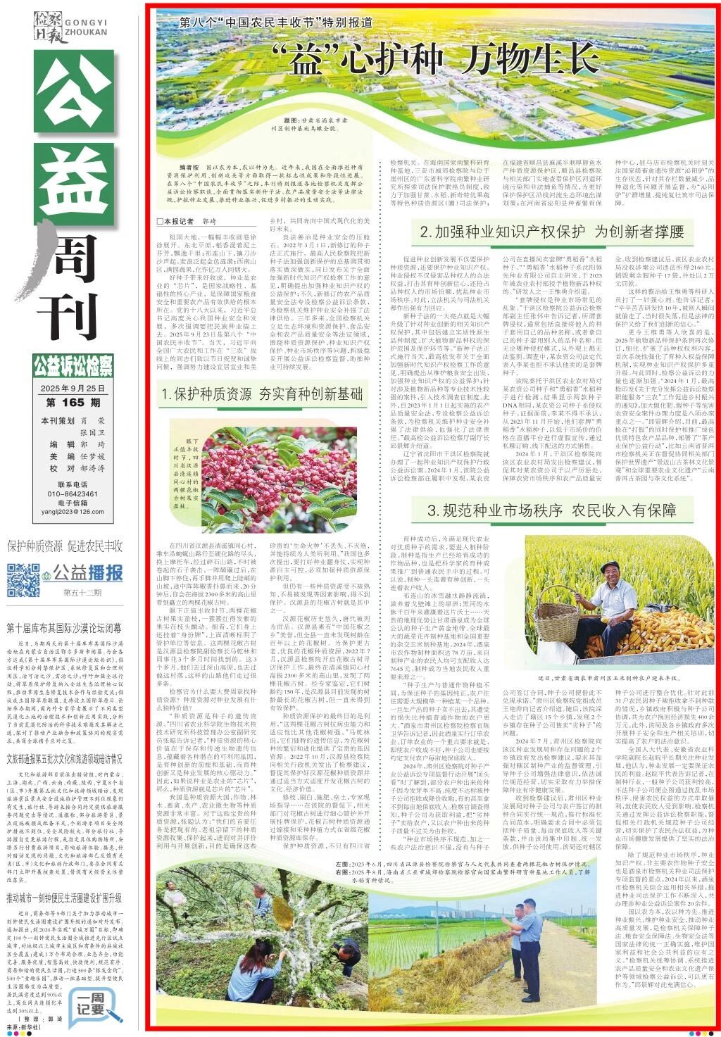 2025年9月25日,检察日报公益周刊刊发《第八个“中国农民丰收节”特别报道:“益”心护种 万物生长》。
