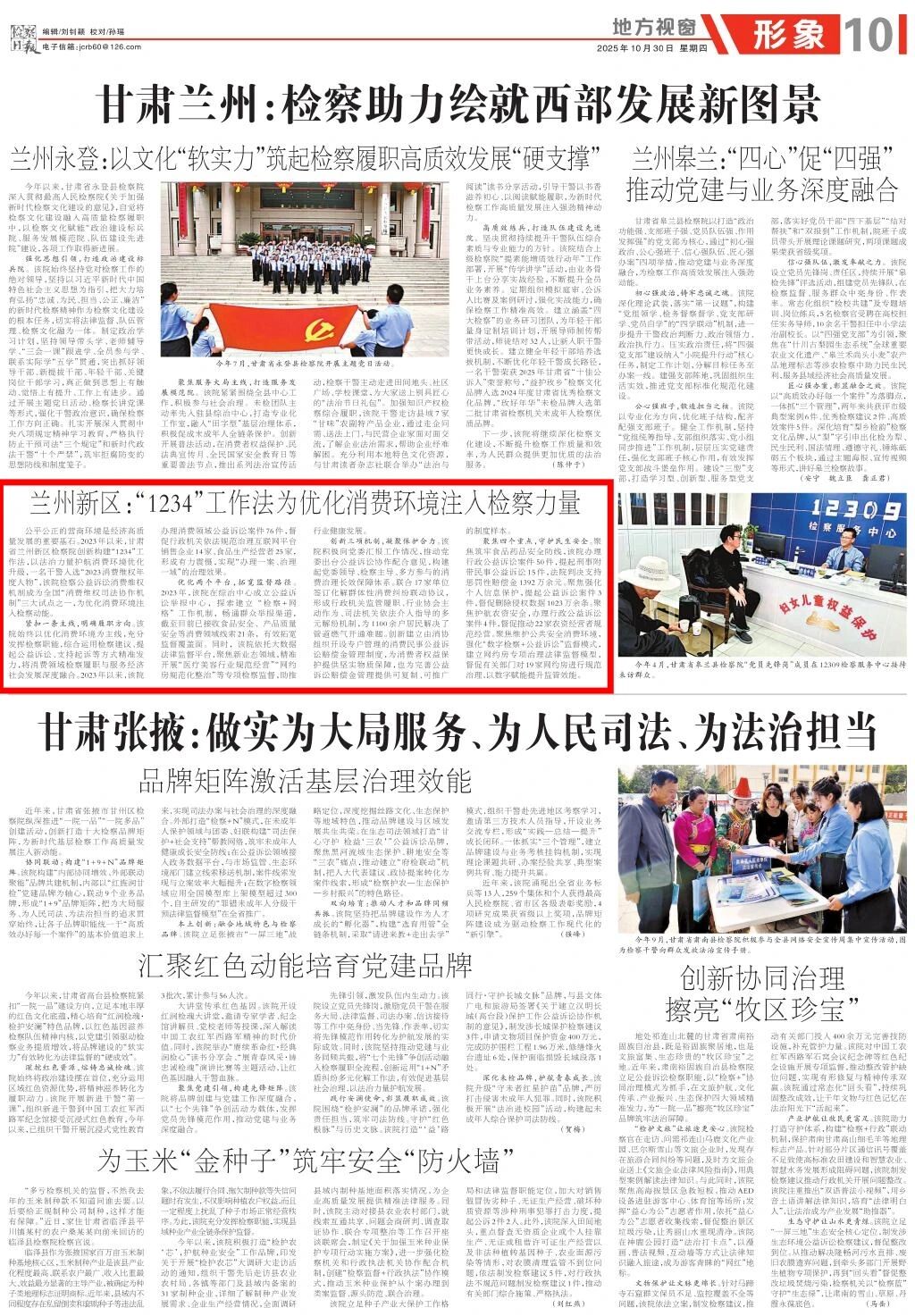 2025年10月30日,检察日报地方视窗《甘肃兰州:检察助力绘就西部发展新图景》专版刊发《兰州新区:“1234”工作法为优化消费环境注入检察力量》。