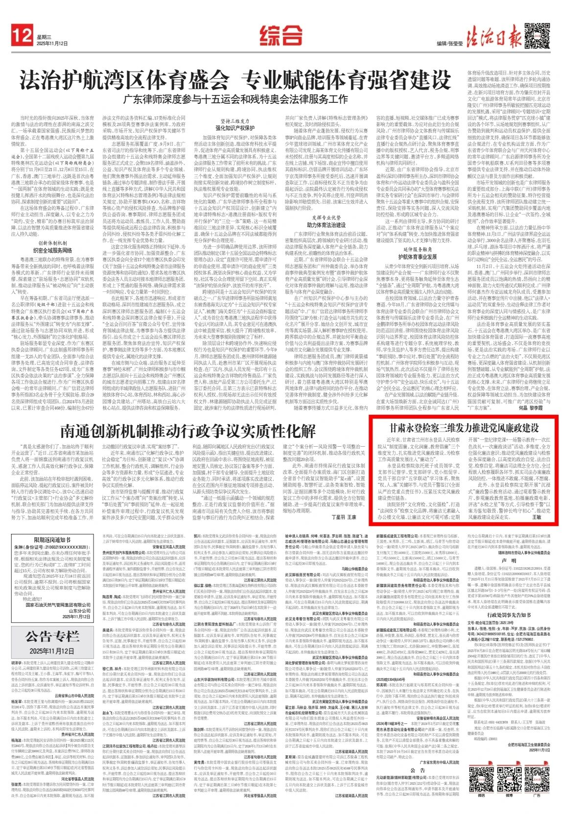 2025年11月12日,法治日报刊发《甘肃永登检察三维发力推进党风廉政建设》。