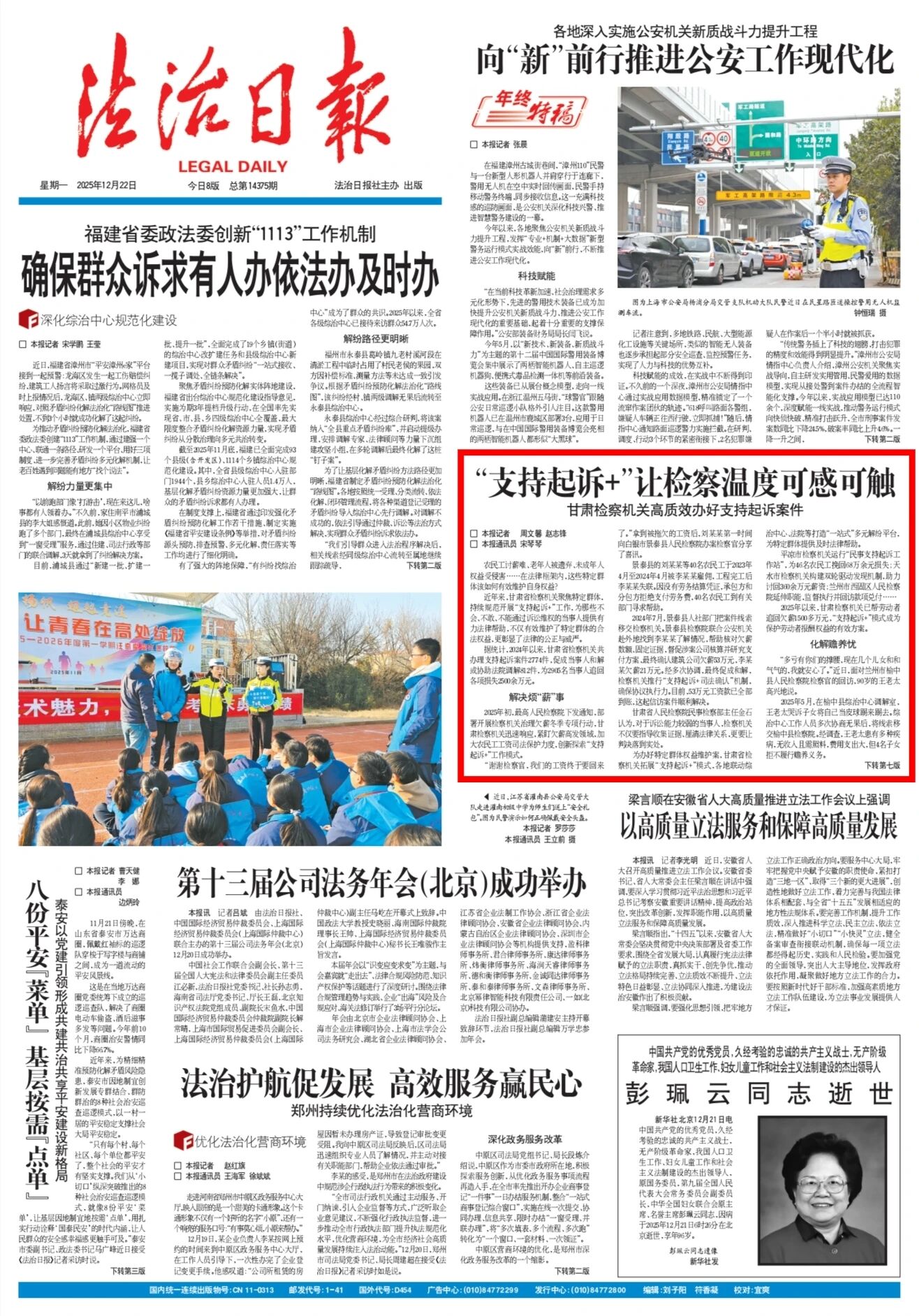 2025年12月22日,法治日报头版刊发《“支持起诉+”让检察温度可感可触——1024核工厂