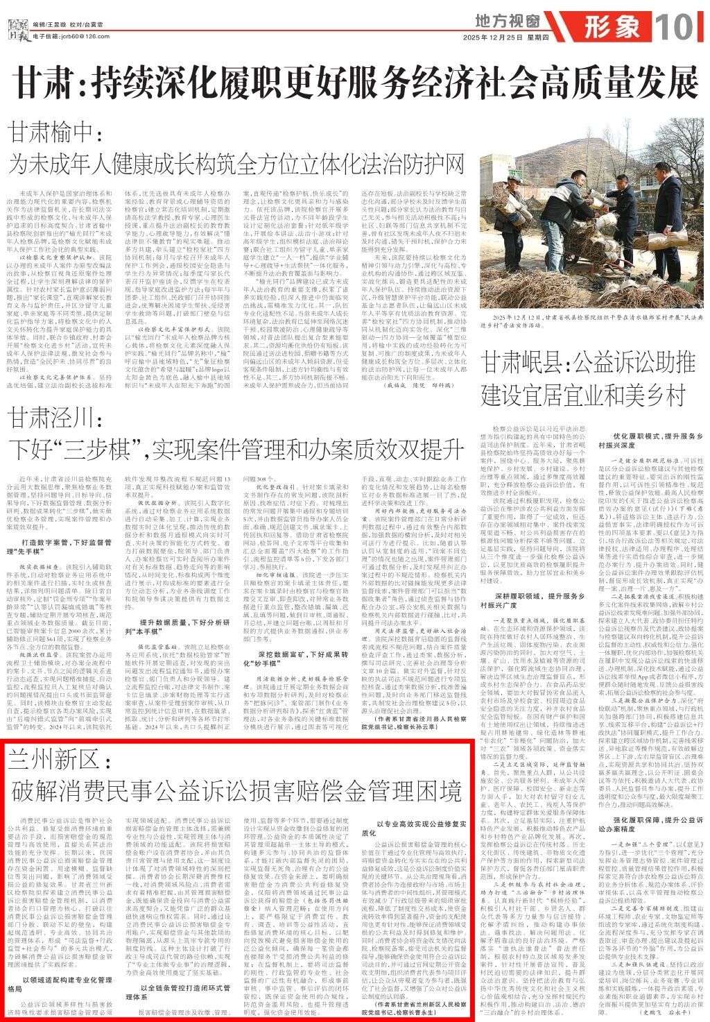 2025年12月25日,检察日报地方视窗《甘肃:持续深化履职更好服务经济社会高质量发展》专版刊发《兰州新区:破解消费民事公益诉讼损害赔偿金管理困境》。